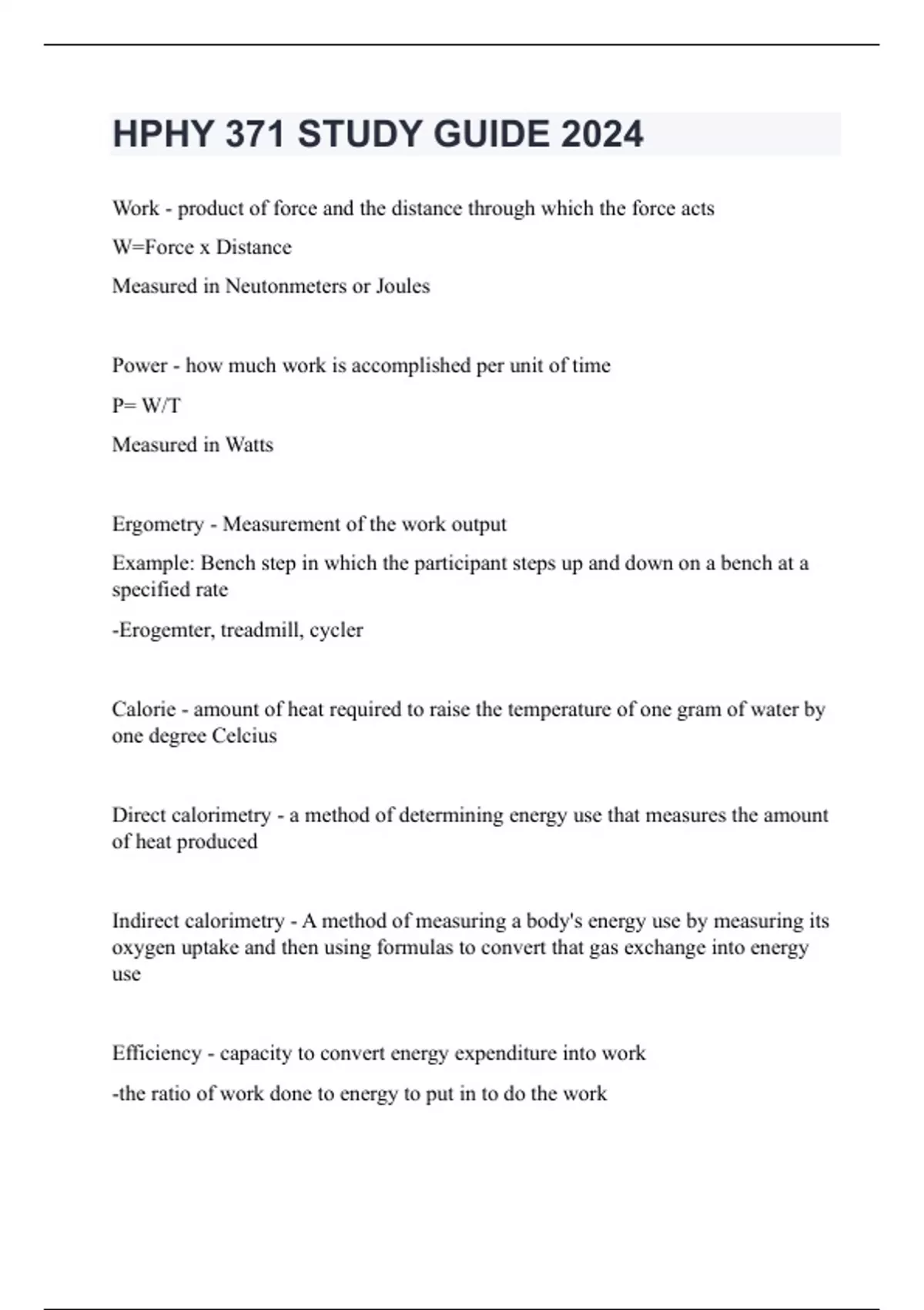 Work - product of force and the distance through which the force acts W=Force x Distance Measured in Neutonmeters or Joules Power - how much work is accomplished per unit of time P= W/T Measured in Watts Ergometry - Measurement of the work output Example: Bench step in which the participant steps up and down on a bench at a specified rate -Erogemter, treadmill, cycler Calorie - amount of heat required to raise the temperature of one gram of water by one degree Celcius Direct calorimetry - a method of determining energy use that measures the amount of heat produced Indirect calorimetry - A method of measuring a body's energy use by measuring its oxygen uptake and then using formulas to convert that gas exchange into energy use Efficiency - capacity to convert energy expenditure into work -the ratio of work done to energy to put in to do the work What factors affect exercise efficiency - exercise work rate( decreases as work rate increases) - speed of movement -fiber composition of the muscles performing the exercise What is exercise? - anything beyond homeostasis What is exercise physiology - study of how the body's structures and functions are altered when exposed to acute and chronic bouts of exercise - the study of intense living and how we survive it Homeostasis - dynamic equilibrium maintained by organism and the enviornment in order to maintain biologically critical variables remaining constant Stressor - an environmental factor which displaces the body from equilbirum conditions Stress - passive bodily displacement specific to the stressor Response - tries to limit acute displacement related to changes Steady state - shift beyond homeostasis in which a new balance point is established
