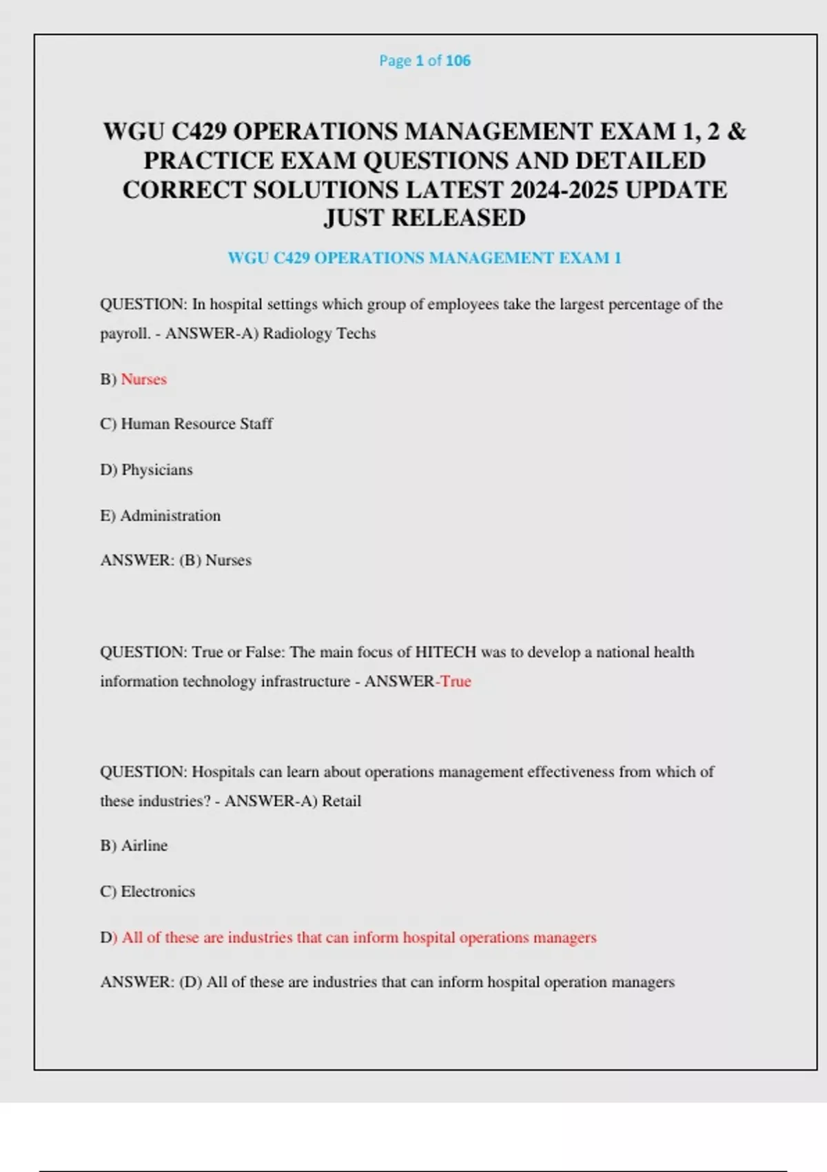 WGU C429 OPERATIONS MANAGEMENT EXAM 1, 2 & PRACTICE EXAM QUESTIONS AND DETAILED CORRECT SOLUTIONS LATEST UPDATE JUST RELEASED