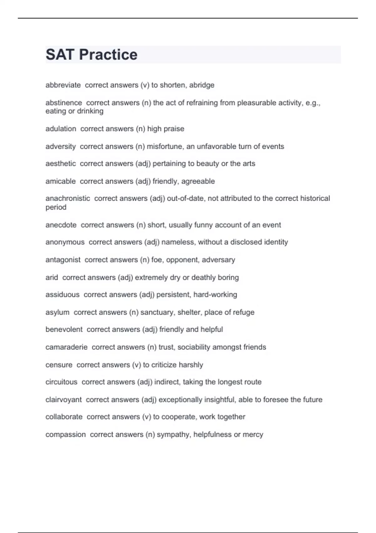 abbreviate correct answers (v) to shorten, abridge abstinence correct answers (n) the act of refraining from pleasurable activity, e.g., eating or drinking adulation correct answers (n) high praise adversity correct answers (n) misfortune, an unfavorable turn of events aesthetic correct answers (adj) pertaining to beauty or the arts amicable correct answers (adj) friendly, agreeable anachronistic correct answers (adj) out-of-date, not attributed to the correct historical period anecdote correct answers (n) short, usually funny account of an event anonymous correct answers (adj) nameless, without a disclosed identity antagonist correct answers (n) foe, opponent, adversary arid correct answers (adj) extremely dry or deathly boring assiduous correct answers (adj) persistent, hard-working asylum correct answers (n) sanctuary, shelter, place of refuge benevolent correct answers (adj) friendly and helpful camaraderie correct answers (n) trust, sociability amongst friends censure correct answers (v) to criticize harshly circuitous correct answers (adj) indirect, taking the longest route clairvoyant correct answers (adj) exceptionally insightful, able to foresee the future collaborate correct answers (v) to cooperate, work together compassion correct answers (n) sympathy, helpfulness or mercy