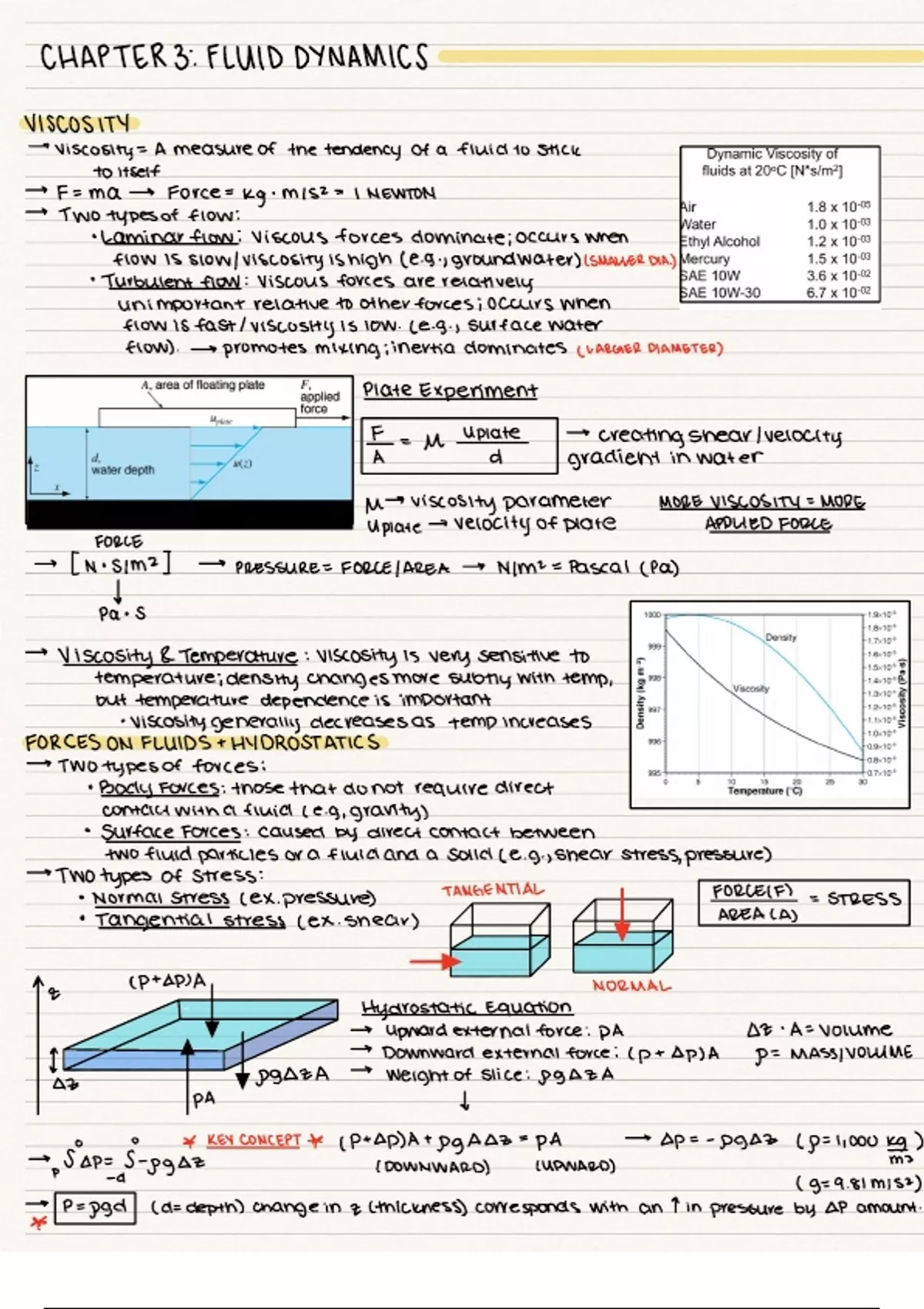 Includes class notes on viscosity (laminar and turbulent flow), forces on fluid and hydrostatics, calculating pressure at depth, applying the hydrostatic equation, fluid acceleration, developing and applying the Bernoulli equation, types of flow with respect to acceleration, the continuity equation, the venturi meter, energy loss and friction in flow, friction in the Bernoulli equation, all with equations and worked through examples.