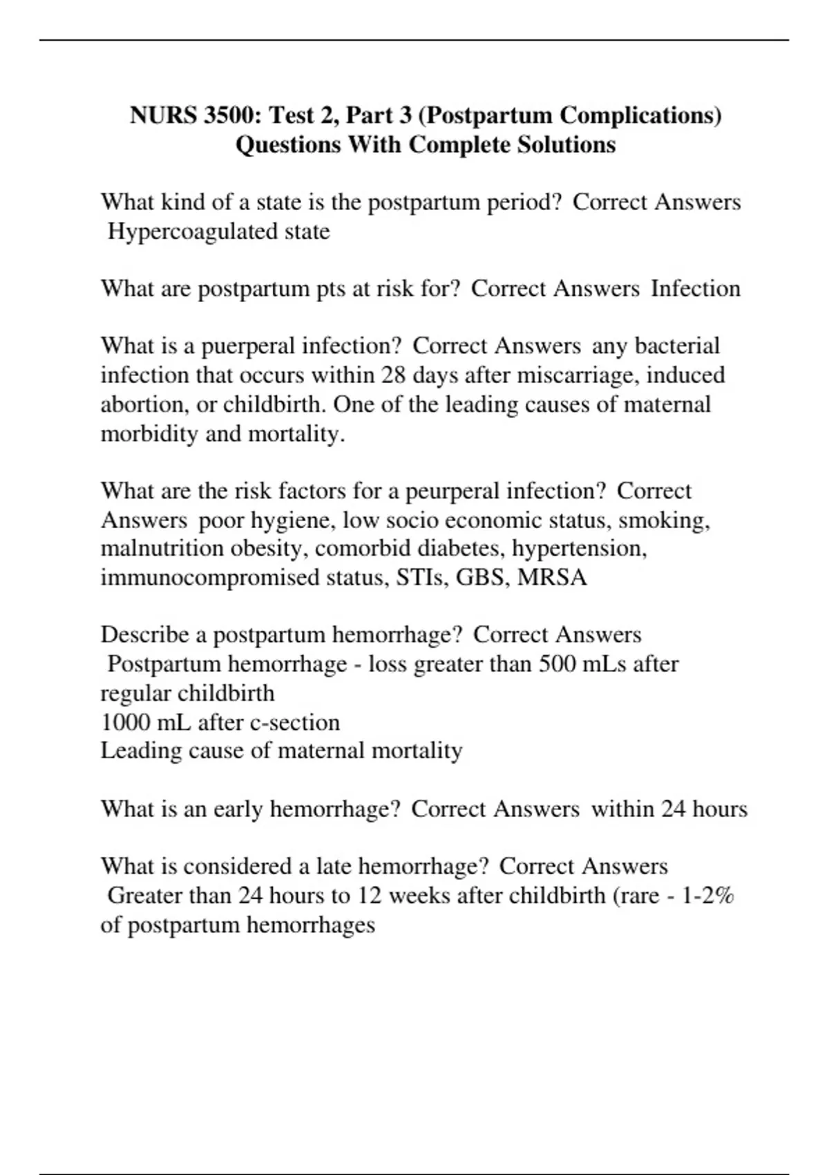 NURS 3500: Test 2, Part 3 (Postpartum Complications) Questions With Complete Solutions