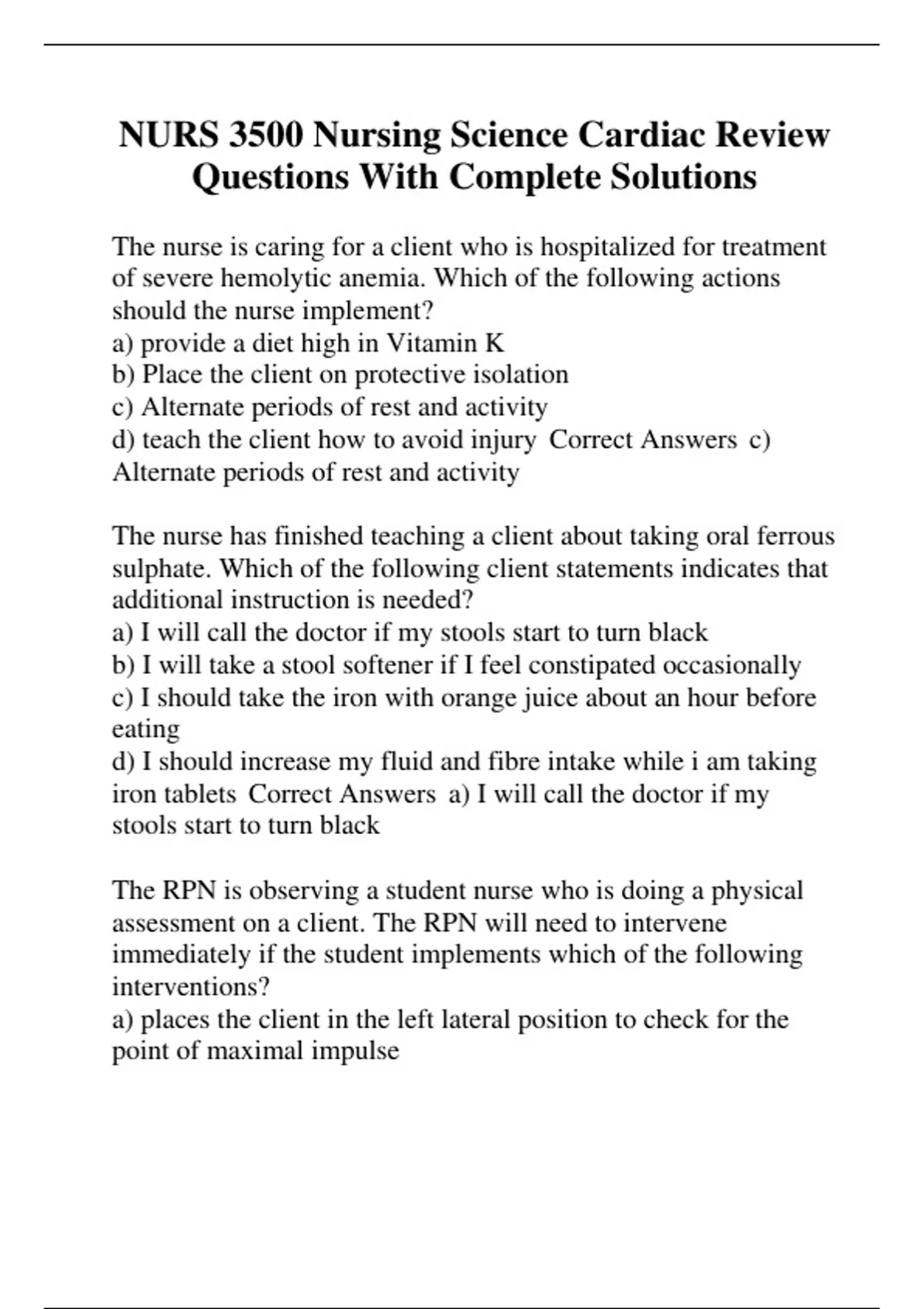 NURS 3500 Nursing Science Cardiac Review Questions With Complete Solutions