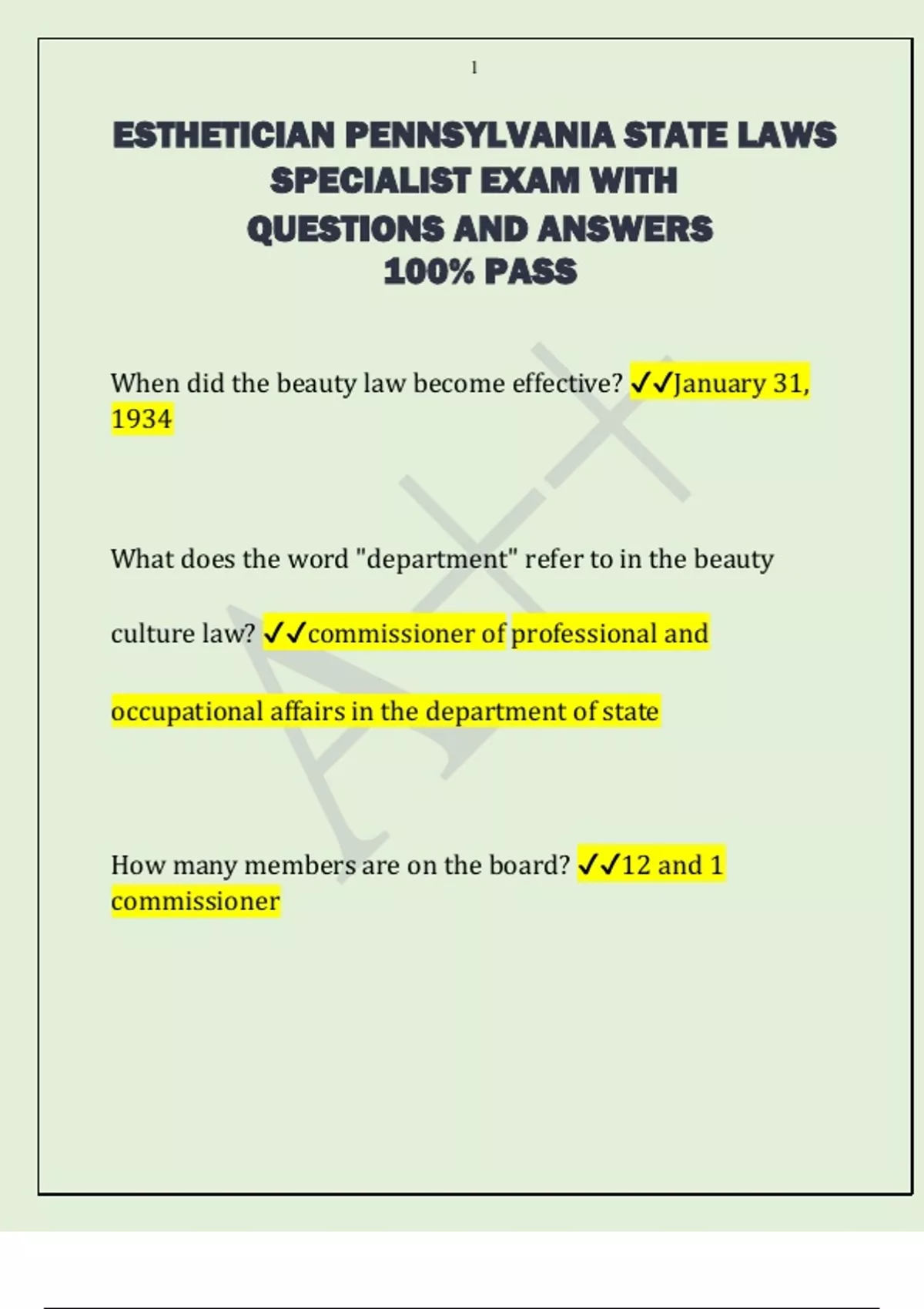 ESTHETICIAN PENNSYLVANIA STATE LAWS SPECIALIST EXAM WITH QUESTIONS AND ANSWERS 100% PASS