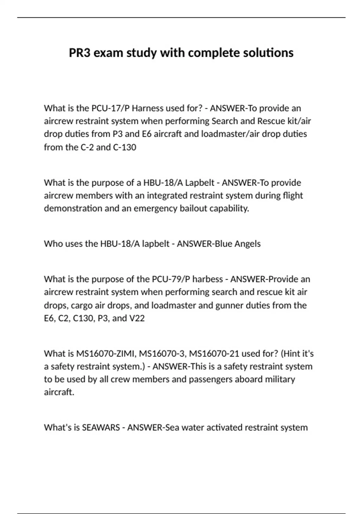 What is the PCU-17/P Harness used for? To provide an aircrew restraint system when performing Search and Rescue kit/air drop duties from P3 and E6 aircraft and loadmaster/air drop duties from the C-2 and C-130 What is the purpose of a HBU-18/A Lapbelt To provide aircrew members with an integrated restraint system during flight demonstration and an emergency bailout capability.
