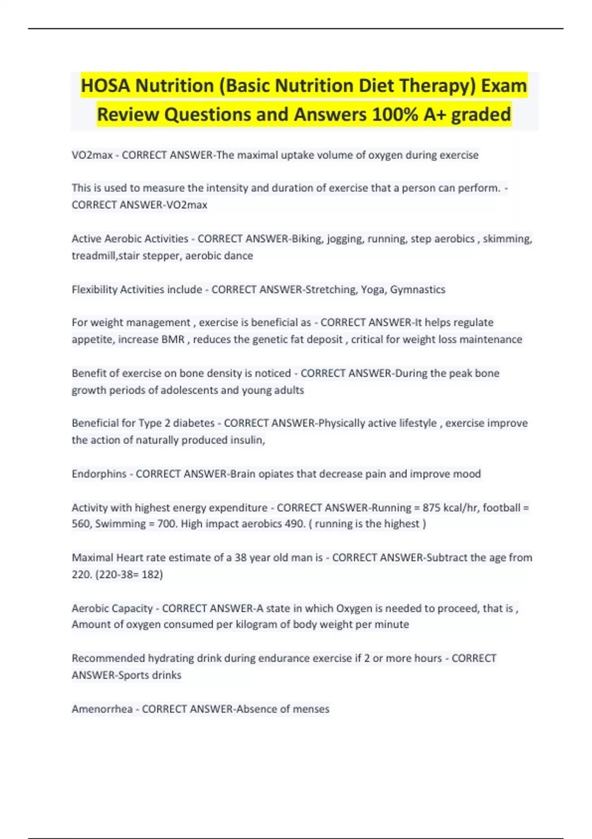 HOSA Nutrition (Basic Nutrition Diet Therapy) Exam Review Questions and Answers 100% A+ graded VO2max - CORRECT ANSWER-The maximal uptake volume of oxygen during exercise This is used to measure the intensity and duration of exercise that a person can perform. - CORRECT ANSWER-VO2max Active Aerobic Activities - CORRECT ANSWER-Biking, jogging, running, step aerobics , skimming, treadmill,stair stepper, aerobic dance Flexibility Activities include - CORRECT ANSWER-Stretching, Yoga, Gymnastics For weight management , exercise is beneficial as - CORRECT ANSWER-It helps regulate appetite, increase BMR , reduces the genetic fat deposit , critical for weight loss maintenance Benefit of exercise on bone density is noticed - CORRECT ANSWER-During the peak bone growth periods of adolescents and young adults Beneficial for Type 2 diabetes - CORRECT ANSWER-Physically active lifestyle , exercise improve the action of naturally produced insulin, Endorphins - CORRECT ANSWER-Brain opiates that decrease pain and improve mood Activity with highest energy expenditure - CORRECT ANSWER-Running = 875 kcal/hr, football = 560, Swimming = 700. High impact aerobics 490. ( running is the highest ) Maximal Heart rate estimate of a 38 year old man is - CORRECT ANSWER-Subtract the age from 220. (220-38= 182) Aerobic Capacity - CORRECT ANSWER-A state in which Oxygen is needed to proceed, that is , Amount of oxygen consumed per kilogram of body weight per minute Recommended hydrating drink during endurance exercise if 2 or more hours - CORRECT ANSWER-Sports drinks Amenorrhea - CORRECT ANSWER-Absence of menses Ideal Pregame meal should have - CORRECT ANSWER-High Carbohydrate and low fat and fiber , and moderate in protein content To establish Euhydration before exercise - CORRECT ANSWER-Drink 5-7ml/kg body weight of water or sports beverage at least 4 hour before exercise . During exercise , excessive water loss is - CORRECT ANSWER-Loss of more than 2% of body weight from water . Ergogenic - CORRECT ANSWER-The tendency to increase the work output ; various substances that increase work or exerc de capacity and output. Gynecomastia - CORRECT ANSWER-Excessive development of male breast frequently due to increased estrogen levels. Best choice of athlete pregame meal - CORRECT ANSWER-Pasta, bread, bagels,muffins and cereal with non fat milk what is dietetics? - CORRECT ANSWER-science concerned with nutritional planning and preparation of foods What is a Registered Dietitian? - CORRECT ANSWER-A professionally trained and educated (person) in dietetics What is nutrition? - CORRECT ANSWER-Nourishment, the food we eat and how the body uses it What are the signs of good nutrition? - CORRECT ANSWER-Well developed body Good muscle development Clear eyes Smooth skin Good posture Glossy hair Alert Ideal weight for body composition (ration of muscle mass to height) Positive outlook Resists infections Normal appetite