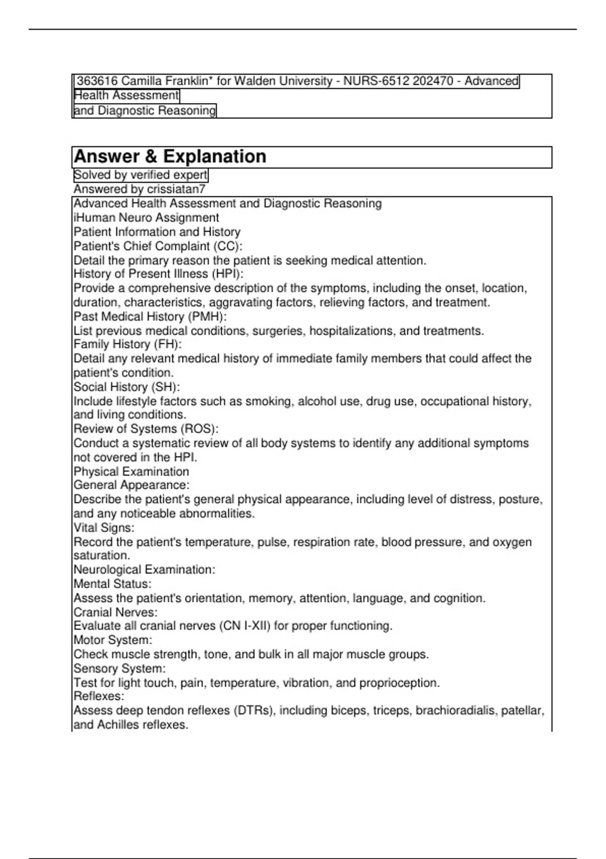 363616 Camilla Franklin* for Walden University - NURS -6512 202470 - Advanced Health Assessment and Diagnostic Reasoning Answer & Explanation Solved by verified expert Answered by crissiatan7 Advanced Health Assessment and Diagnostic Reasoning iHuman Neuro Assignment Patient Information and History Patient's Chief Complaint (CC): Detail the primary reason the patient is seeking medical attention. History of Present Illness (HPI): Provide a comprehensive description of the symptoms, including the onset, location, duration, characteristics, aggravating factors, relieving factors, and treatment. Past Medical History (PMH): List previous medical conditions, surgeries, hospitalizations, and treatments. Family History (FH): Detail any relevant medical history of immediate family members that could affect the patient's condition. Social History (SH): Include lifestyle factors such as smoking, alcohol use, drug use, occupational history, and living conditions. Review of Systems (ROS): Conduct a systematic review of all body systems to identify any additional symptoms not covered in the HPI. Physical Examination General Appearance: Describe the patient's general physical appearance, including level of distress, posture, and any noticeable abnormalities. Vital Signs: Record the patient's temperature, pulse, respiration rate, blood pressure, and oxygen saturation. Neurological Examination: Mental Status: Assess the patient's orientation, memory, attention, language, and cognition. Cranial Nerves: Evaluate all cranial nerves (CN I -XII) for proper functioning. Motor System: Check muscle strength, tone, and bulk in all major muscle groups. Sensory System: Test for light touch, pain, temperature, vibration, and proprioception. Reflexes: Assess deep tendon reflexes (DTRs), including biceps, triceps, brachioradialis, patellar, and Achilles reflexes. Coordination: Perform tests for coordination such as finger -to-nose, heel -to-shin, and rapid alternating movements. Gait and Balance: Observe the patient's gait, including walking on heels, toes, and tandem gait. Diagnostic Testing Imaging Studies: Detail any imaging studies performed, such as CT scan, MRI, or X -rays, including the rationale for each and the findings. Laboratory Tests: List laboratory tests ordered and thei r results, explaining how they support the diagnosis. Special Tests: Include any special tests conducted, such as lumbar puncture, EEG, or EMG, with a discussion on their findings and implications. Differential Diagnosis List of Differential Diagnoses: Provide a list of potential diagnoses, ranked by likelihood. Rationale for Differential Diagnoses: Discuss why each differential diagnosis is considered, based on the patient's history, physical examination, and diagnostic test results. Final Diagnosis Final Diagnosis: State the final diagnosis. Justification for Final Diagnosis: Explain how the patient's presentation, examination findings, and diagnostic test results led to the final diagnosis. Management Plan Treatment Plan: Outline the treatment plan, including medications, dosages, and other therapeutic interventions. Patient Education: Provide information on how to educate the patient about their condition, treatment, and any necessary lifestyle modifications. Follow -Up: Describe the follow -up plan, including any further appointments, tests, or evaluations needed. Case Reflection Reflection on Case: Reflect on the case, including what was learned, what could have been done differently, and any challenges faced during the ass essment and diagnostic process. Implications for Practice: Discuss the implications of this case for future practice, including any changes to clinical approach or patient management strategies. Step-by-step explanation Example Answer: