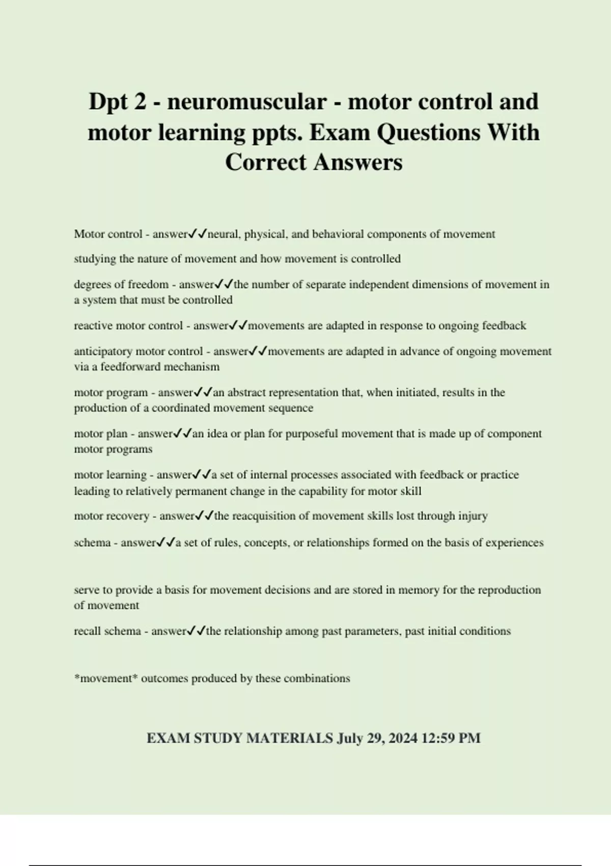 Dpt 2 - neuromuscular - motor control and motor learning ppts. Exam Questions With Correct Answers