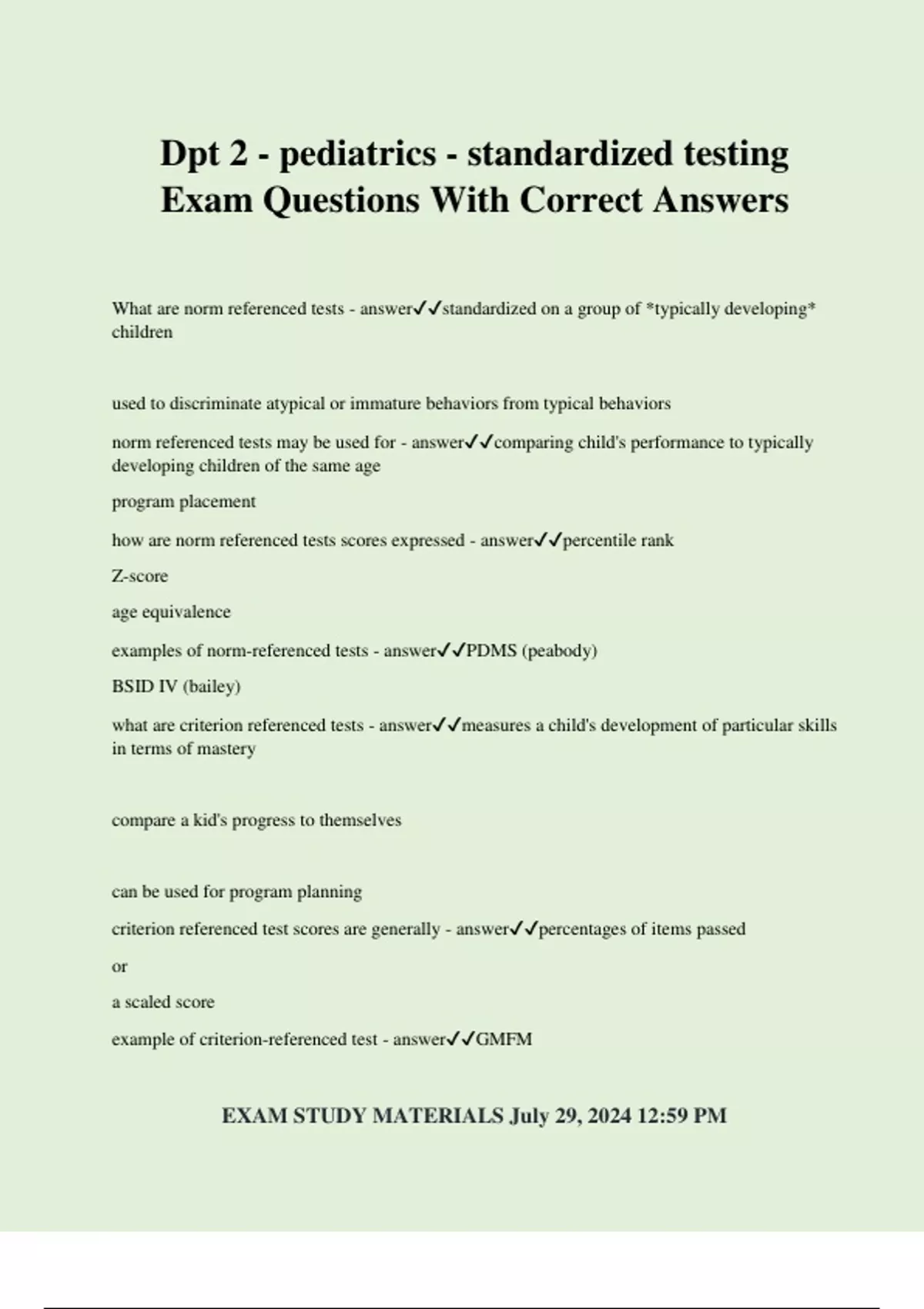 Dpt 2 - pediatrics - standardized testing Exam Questions With Correct Answers What are norm referenced tests - answerstandardized on a group of *typically developing* children used to discriminate atypical or immature behaviors from typical behaviors norm referenced tests may be used for - answercomparing child's performance to typically developing children of the same age program placement how are norm referenced tests scores expressed - answerpercentile rank Z-score age equivalence examples of norm-referenced tests - answerPDMS (peabody) BSID IV (bailey) what are criterion referenced tests - answermeasures a child's development of particular skills in terms of mastery compare a kid's progress to themselves can be used for program planning criterion referenced test scores are generally - answerpercentages of items passed or a scaled score example of criterion-referenced test - answerGMFM EXAM STUDY MATERIALS July 29, 2024 12:59 PM percentiles - answerthe percentage of scores in the comparison group which are lower than the test taker's score ex: percentile score of 75% means that you scored higher than 75%of test takers we want kids to score 50% or above, well below could indicate therapy scaled scores - answerraw score that has been adjusted and converted to a standardized scale Z-scores aka standard score - answerstandard deviations from the mean how many SDs below the mean qualifies a pt for services/PT - answer2 SDs *in Washington state, 1.5 SD below the mean qualifies for services or 25% standard delay* what is percent delay - answerchronological age -developmental age/chronological age x100 ex: 12 months - 9 months / 12 months * 100 = 25% delay *a child has a score in the 50th percentile... what would you expect his standard score to be* - answer100 scaled score would be 10 *name three reasons standardized testing is important* - answerresearch qualification for services placement into programs PDMS-2 - answerPeabody developmental motor scales 2 primary uses of PDMS-2 - answerto identify children whose gross and fine *motor skills* are delayed to compare performance of gross motor and fine moto
