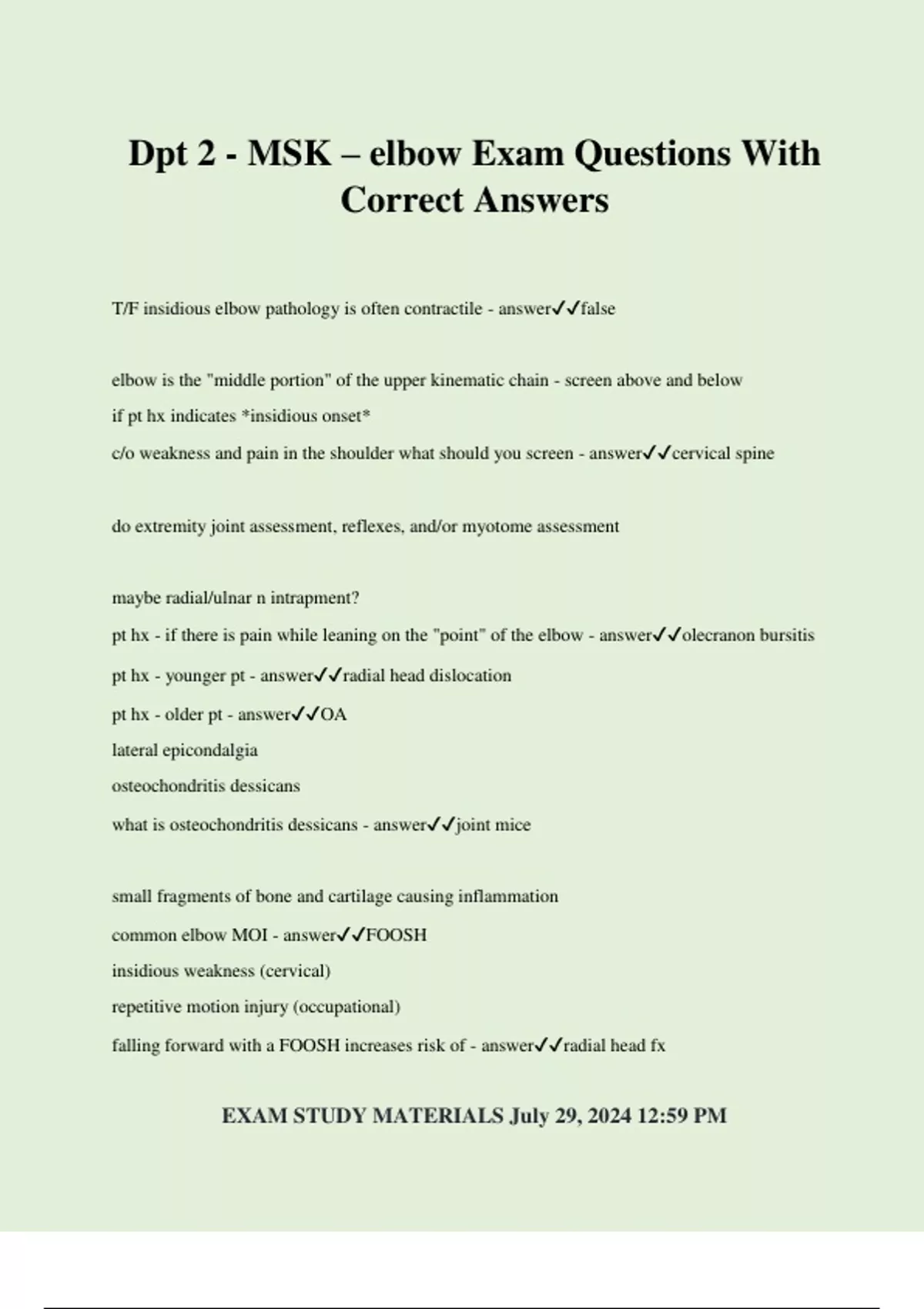 Dpt 2 - MSK – elbow Exam Questions With Correct Answers T/F insidious elbow pathology is often contractile - answerfalse elbow is the "middle portion" of the upper kinematic chain - screen above and below if pt hx indicates *insidious onset* c/o weakness and pain in the shoulder what should you screen - answercervical spine do extremity joint assessment, reflexes, and/or myotome assessment maybe radial/ulnar n intrapment? pt hx - if there is pain while leaning on the "point" of the elbow - answerolecranon bursitis pt hx - younger pt - answerradial head dislocation pt hx - older pt - answerOA lateral epicondalgia osteochondritis dessicans what is osteochondritis dessicans - answerjoint mice small fragments of bone and cartilage causing inflammation common elbow MOI - answerFOOSH insidious weakness (cervical) repetitive motion injury (occupational) falling forward with a FOOSH increases risk of - answerradial head fx EXAM STUDY MATERIALS July 29, 2024 12:59 PM falling backwards with a FOOSH increases risk of - answerolecranon fx pt hx - locking or catching - answerloose body possible see joint mice pt hx - inability to fully extend - answerpotential synovitis or fx if following trauma do *elbow extension test SN = 0.97-1.0* pt hx - if doing athetics/activity and felt a "pop" with pain and swelling medially - answermaybe MCL sprain pt hx - athletic populations - answerlook at equipment, consider acute vs gradual throwing injuries pt hx - what should you ask regarding timeline - answerlength of time the injury has been present and sx location to figure out stage of injury, tissue involved UCL - ulnar collateral lig - what surgery to repair - answertommy john's conditions at the elbow are commonly described by - answerlocation eg: lateral epicondalgia, radial tunnel syndrome medial elbow impairments - answergolfer's elbow little leaguer's elbow (UCL) cubital tunnel syndrome (ulnar n) anterior elbow impairments - answerbiceps tendonitis/-osis biceps bursitis/tumor posterior elbow impairments - answerolecranon bursitis olecranon fx triceps tendonitis/-osis (rare) EXAM STUDY MATERIALS July 29, 2024 12:59 PM cubital fossa pain - answertear of brachialis mm at MT junction biceps brachii lesion left arm/elbow pain precipitated by physical exertion and relieved by rest - answerangina objective exam of the elbow - answerobservation screen above and below palpation AROM with passive overpressure resisted testing (RI, MMT) joint play special tests screening when suspecting fx - answertuning fork and stethoscope do unaffected side first meh psychometrics A/PROM prime movements at the elbow - answerflexion extension supination pronation is ROM limited vs full, painful vs painless combined motions at the elbow to test - answerflexion, adduction, forearm pronation flexion, abduction, forearm supination extension, abduction, forearm pronati