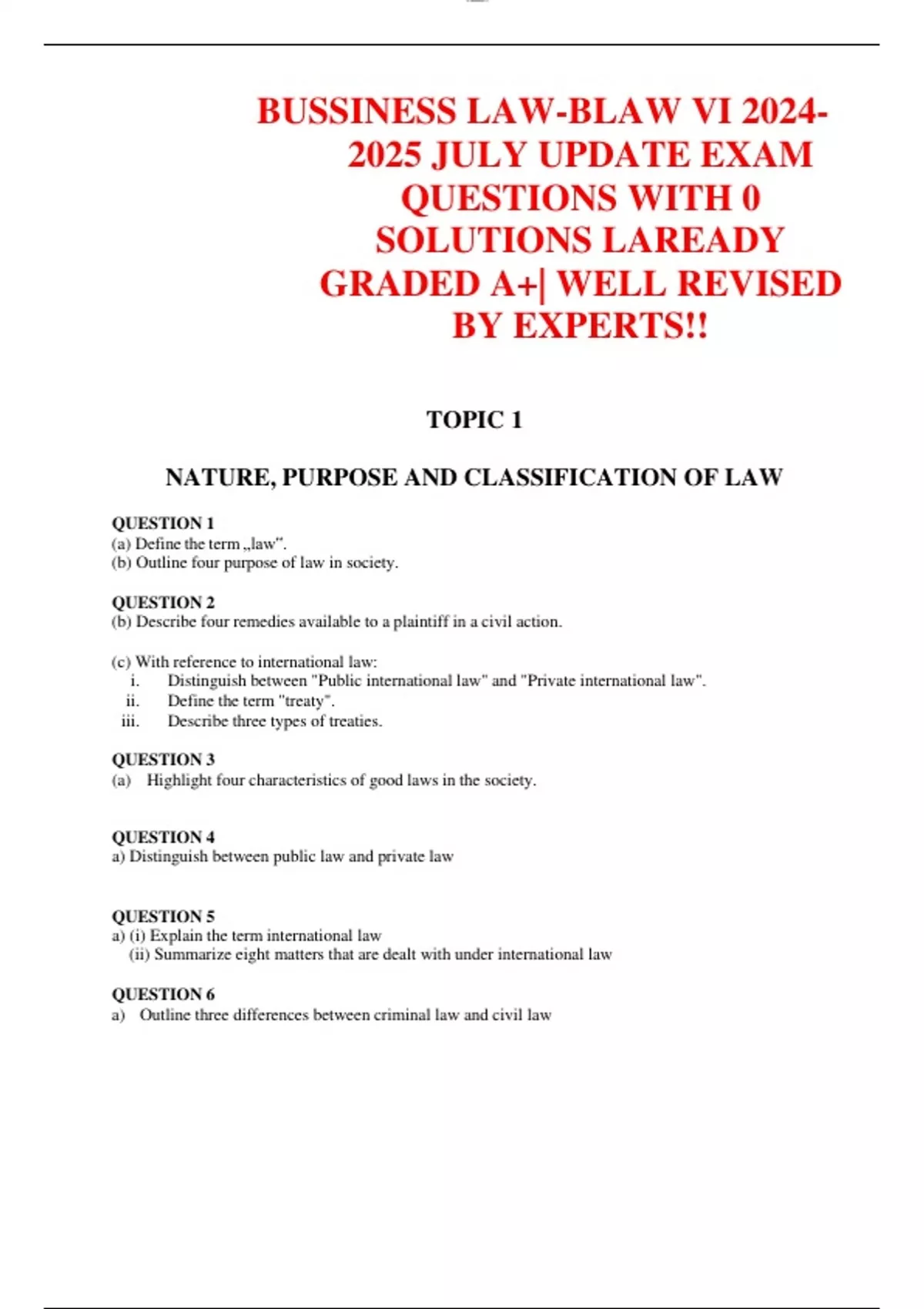 BUSSINESS LAW-BLAW VI JULY UPDATE EXAM QUESTIONS WITH 0 SOLUTIONS LAREADY GRADED A+| WELL REVISED BY EXPERTS!!