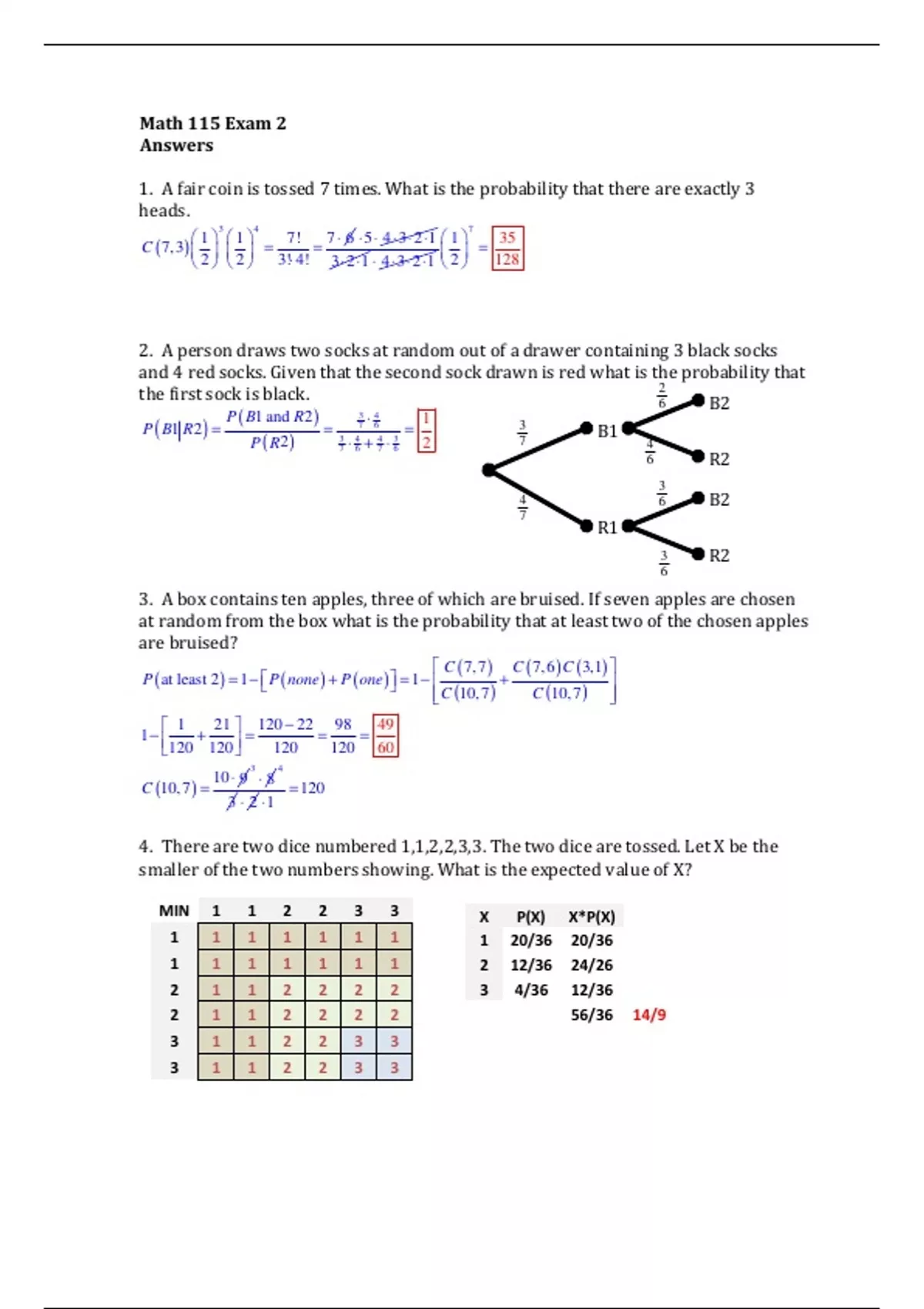 Answers 1. A fair coin is tossed 7 times. What is the probability that there are exactly 3 heads. ( ) 3 4 1 1 7! 7 6 7,3 2 2 3!4! C ⋅ = = ⋅ 5 4321 ⋅ ⋅ ⋅ ⋅ ⋅ 321 ⋅ ⋅ 4321 ⋅ ⋅ ⋅ ⋅ 7 35 128 1 2 = 2. A person draws two socks at random out of a drawer containing 3 black socks and 4 red socks. Given that the second sock drawn is red what is the probability that the first sock is black. ( ) ( ) ( ) 3 4 7 6 3 3 4 4 7 6 7 6 1 and 2 1 2 2 1 2 PB R PB R PR ⋅ = = = ⋅ + ⋅ 3. A box contains ten apples, three of which are bruised. If seven apples are chosen at random from the box what is the probability that at least two of the chosen apples are bruised? ( ) ( ) ( ) ( ) ( ) ( ) ( ) ( ) ( ) 7,7 7,6 3,1 at least 2 1 1 10,7 10,7 10 49 6 9 10 0 ,7 C C C P Pnone Pone C C C = − + = − + − − + = = = ⋅ = 3 8 ⋅ 4 3 2 ⋅ 120 1 = ⋅ 4. There are two dice numbered 1,1,2,2,3,3. The two dice are tossed. Let X be the smaller of the two numbers showing. What is the expected value of X? MIN 1 1 2 2 3 3 1 1 1 1 1 1 1 1 1 1 1 1 1 1 2 1 1 2 2 2