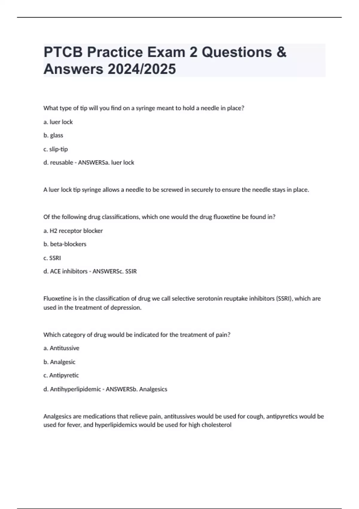 PTCB Practice Exam 2 Questions & Answers 2024/2025 What type of tip will you find on a syringe meant to hold a needle in place? a. luer lock b. glass c. slip-tip d. reusable - ANSWERSa. luer lock A luer lock tip syringe allows a needle to be screwed in securely to ensure the needle stays in place. Of the following drug classifications, which one would the drug fluoxetine be found in? a. H2 receptor blocker b. beta-blockers c. SSRI d. ACE inhibitors - ANSWERSc. SSIR Fluoxetine is in the classification of drug we call selective serotonin reuptake inhibitors (SSRI), which are used in the treatment of depression. Which category of drug would be indicated for the treatment of pain? a. Antitussive b. Analgesic c. Antipyretic d. Antihyperlipidemic - ANSWERSb. Analgesics Analgesics are medications that relieve pain, antitussives would be used for cough, antipyretics would be used for fever, and hyperlipidemics would be used for high cholesterol