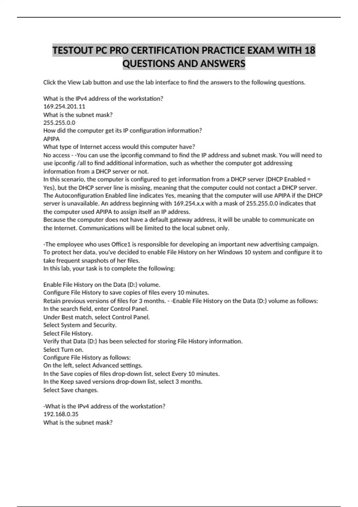 TESTOUT PC PRO CERTIFICATION PRACTICE EXAM WITH 18 QUESTIONS AND ANSWERS