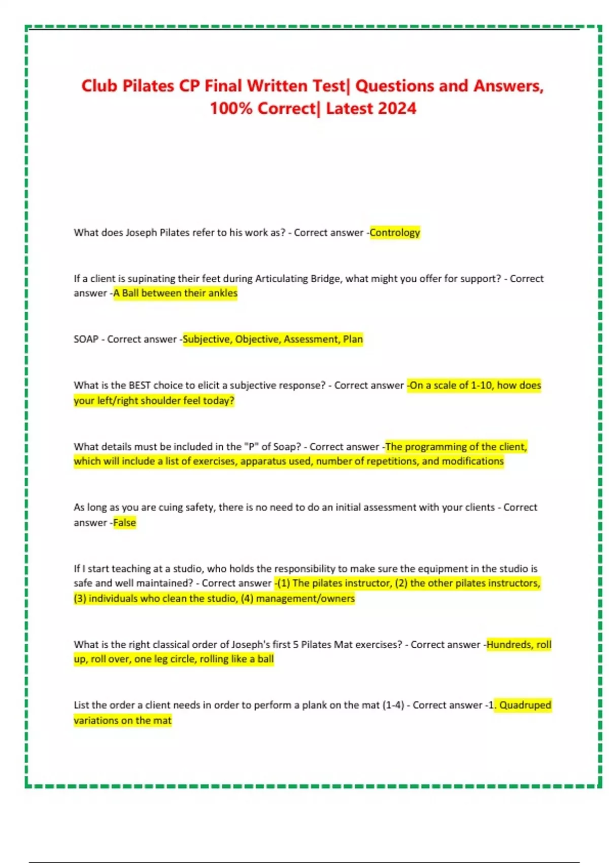Club Pilates CP Final Written Test| Questions and Answers, 100% Correct| Latest 2024