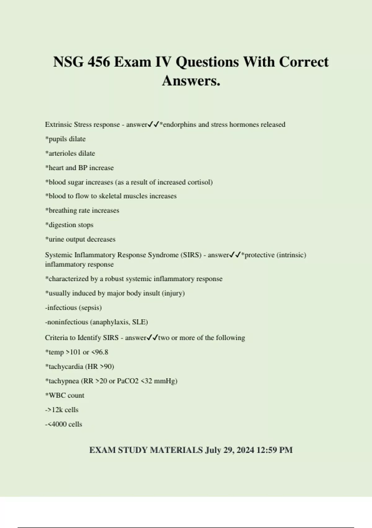 NSG 456 Exam IV Questions With Correct Answers. Extrinsic Stress response - answer*endorphins and stress hormones released *pupils dilate *arterioles dilate *heart and BP increase *blood sugar increases (as a result of increased cortisol) *blood to flow to skeletal muscles increases *breathing rate increases *digestion stops *urine output decreases Systemic Inflammatory Response Syndrome (SIRS) - answer*protective (intrinsic) inflammatory response *characterized by a robust systemic inflammatory response *usually induced by major body insult (injury) -infectious (sepsis) -noninfectious (anaphylaxis, SLE) Criteria to Identify SIRS - answertwo or more of the following *temp 101 or 96.8 *tachycardia (HR 90) *tachypnea (RR 20 or PaCO2 32 mmHg) *WBC count -12k cells -4000 cells EXAM STUDY MATERIALS July 29, 2024 12:59 PM 10% immature WBC (aka "bands", neutrophils) NOT HELPFUL IN DIAGNOSIS SEPSIS Shock definition - answera clinical syndrome that results from inadequate tissue perfusion, creating an imbalance between the delivery of oxygen and nutrients needed to support cellular function Shock - answer*shock is initially reversible, but must be recognized and treated immediately to prevent irreversible organ dysfunction *all body systems are affected *hypoperfusion of the tissues *hypermetabolism *SIRS Does shock mean low blood pressure? - answerIt can depend on the type of shock. Most shock is hypotensive, but it can be hypertensive (cardiogenic). Steps of Shock - answer1. Inadequate perfusion - not enough oxygen gets to cells 2. Cells forced to switch to anaerobic respiration 3. Lactic acid builds up - metabolic acidosis 4. Vasoconstriction - venous pooling 5. endothelial damage -cell membrane dysfunction and loss of sodium-potassium pump -decrease in vascular oncotic pressure -increased 3rd spacing from intravascular space -efflux of potassium -influx of sodium and water many organ cells die = ORGAN DEATH Compensatory Mechanisms of Shock - answer Clinical Findings in Stages of Shock - answer Compensatory Stage of Shock - answer*SNS stimulation *body shunts blood to only core organs EXAM STUDY MATERIALS July 29, 2024 12:59 PM *tissue perfusion becomes inadequate *acidosis occurs due to anaerobic metabolism *RR increases due to acidosis *confusion may occur Progressive Stage of Shock - answer*BP and MAP decrease *all organs suffer from hypoperfusion *vasoconstriction continues *mental status further deteriorates *decrease in pulmonary blood flow causes further hypoxemia *inadequate perfusion of heart leads to dysrhythmias and ischemia *MAP falls below 70 *GFR cannot be maintained *function of liver, GI, and blood all impaired *disseminated intravascular coagulation (DIC) may occur as cause or complication of shock Disseminated Intravascular Coagulation (DIC) - answer*clot, lyse clot, all coag factors used up - BLEED, BLEED, BLEED *abnormal labs (low plt, high PT + aPTT, high D-dimer + FDPs) *tx underlying disease, hypotension, tissue perfusion, acidosis, and hypoxia Irreversible Stage of Shock - answer*organ damage is so severe that patient does not respond to tx and cannot survive *BP remains low *anaerobic metabolism worsens; acidosis *multiple organ dysfunction progresses to complete organ failure *judgment that shock is irreversible often only made in retrospect *focused more on comfort care Multiple Organ Dysfunction Syndrome (MODS) - answer*altered function of two or more organs *medical interventions necessary to support continued organ function EXAM STUDY MATERIALS July 29, 2024 12:59 PM *high mortality rate: 60-75% Treatment to Reverse MODS - answer*controlled environment (quiet, low stimulation) *promoting adequate organ perfusion *providing nutritional support *maximizing comfort Modified Trendelenburg - answer*used in patients with shock to promote blood circulation back to heart Fluid Replacement in Shock - answer*intravenous *lactated ringers (most lytes) *colloids - albumin, PRBCs Hemodynamic and Cardiac Monitoring in Shock - answer*increase tissue perfusion *monitor UO *arterial line *capnography - measures end tidal CO2 Maintaining Airway and Oxygenation in Shock/Advanced Airway - answer*ventilation *intubation *ventilator VAP prevention bundle - answer-Elevation of the HOB between 30 and 45 degrees. -Daily "sedation vacations" to assess readiness to extubate. -Peptic ulcer disease prophylaxis. -DVT prophylaxis. -adequate oral hygiene -Q2 turns Medications for Shock - answer