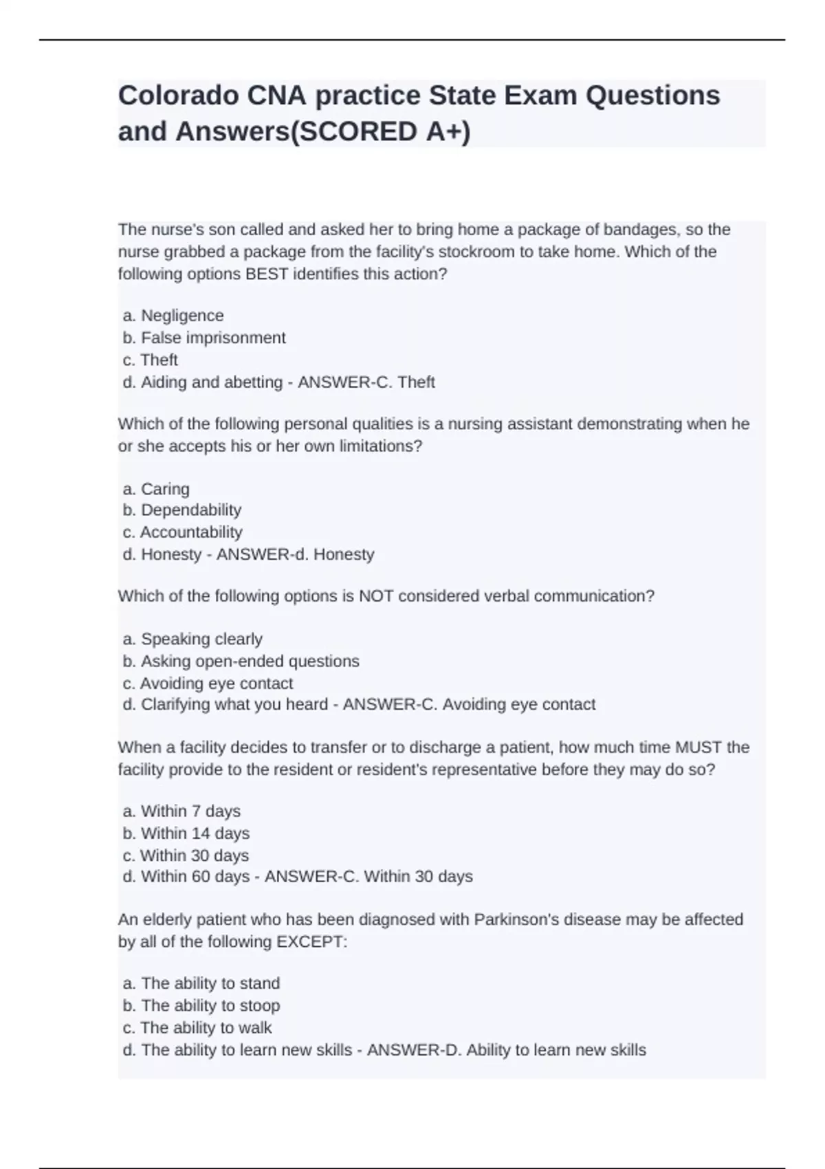 The nurse's son called and asked her to bring home a package of bandages, so the nurse grabbed a package from the facility's stockroom to take home. Which of the following options BEST identifies this action? a. Negligence b. False imprisonment c. Theft d. Aiding and abetting - ANSWER-C. Theft Which of the following personal qualities is a nursing assistant demonstrating when he or she accepts his or her own limitations? a. Caring b. Dependability c. Accountability d. Honesty - ANSWER-d. Honesty Which of the following options is NOT considered verbal communication? a. Speaking clearly b. Asking open-ended questions c. Avoiding eye contact d. Clarifying what you heard - ANSWER-C. Avoiding eye contact When a facility decides to transfer or to discharge a patient, how much time MUST the facility provide to the resident or resident's representative before they may do so? a. Within 7 days b. Within 14 days c. Within 30 days d. Within 60 days - ANSWER-C. Within 30 days An elderly patient who has been diagnosed with Parkinson's disease may be affected by all of the following EXCEPT: a. The ability to stand b. The ability to stoop c. The ability to walk