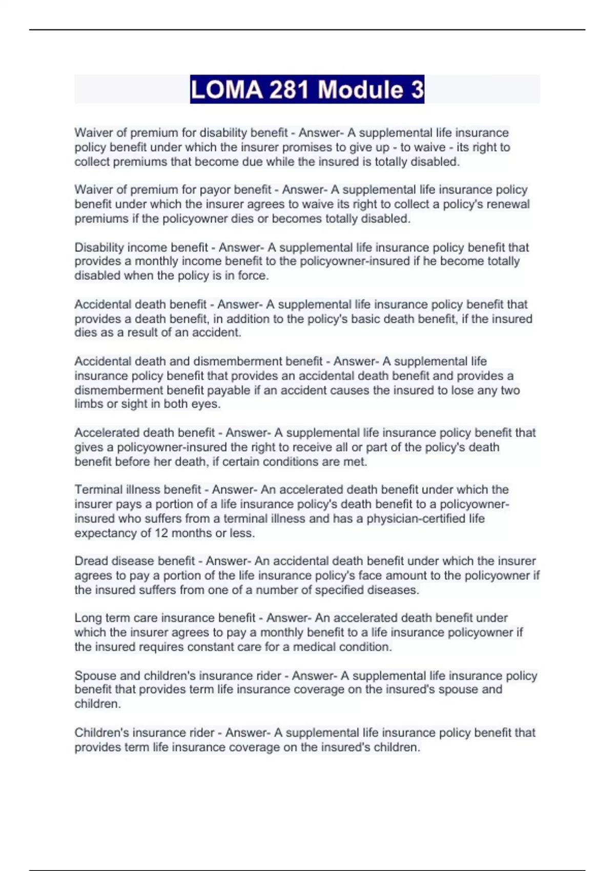 LOMA 281 Module 3 Waiver of premium for disability benefit - Answer- A supplemental life insurance policy benefit under which the insurer promises to give up - to waive - its right to collect premiums that become due while the insured is totally disabled. Waiver of premium for payor benefit - Answer- A supplemental life insurance policy benefit under which the insurer agrees to waive its right to collect a policy's renewal premiums if the policyowner dies or becomes totally disabled. Disability income benefit - Answer- A supplemental life insurance policy benefit that provides a monthly income benefit to the policyowner-insured if he become totally disabled when the policy is in force. Accidental death benefit - Answer- A supplemental life insurance policy benefit that provides a death benefit, in addition to the policy's basic death benefit, if the insured dies as a result of an accident. Accidental death and dismemberment benefit - Answer- A supplemental life insurance policy benefit that provides an accidental death benefit and provides a dismemberment benefit payable if an accident causes the insured to lose any two limbs or sight in both eyes. Accelerated death benefit - Answer- A supplemental life insurance policy benefit that gives a policyowner-insured the right to receive all or part of the policy's death benefit before her death, if certain conditions are met. Terminal illness benefit - Answer- An accelerated death benefit under which the insurer pays a portion of a life insurance policy's death benefit to a policyowner-insured who suffers from a terminal illness and has a physician-certified life expectancy of 12 months or less. Dread disease benefit - Answer- An accidental death benefit under which the insurer agrees to pay a portion of the life insurance policy's face amount to the policyowner if the insured suffers from one of a number of specified diseases. Long term care insurance benefit - Answer- An accelerated death benefit under which the insurer agrees to pay a monthly benefit to a life insurance policyowner if the insured requires constant care for a medical condition. Spouse and children's insurance rider - Answer- A supplemental life insurance policy benefit that provides term life insurance coverage on the insured's spouse and children. Children's insurance rider - Answer- A supplemental life insurance policy benefit that provides term life insurance coverage on the insured's children.