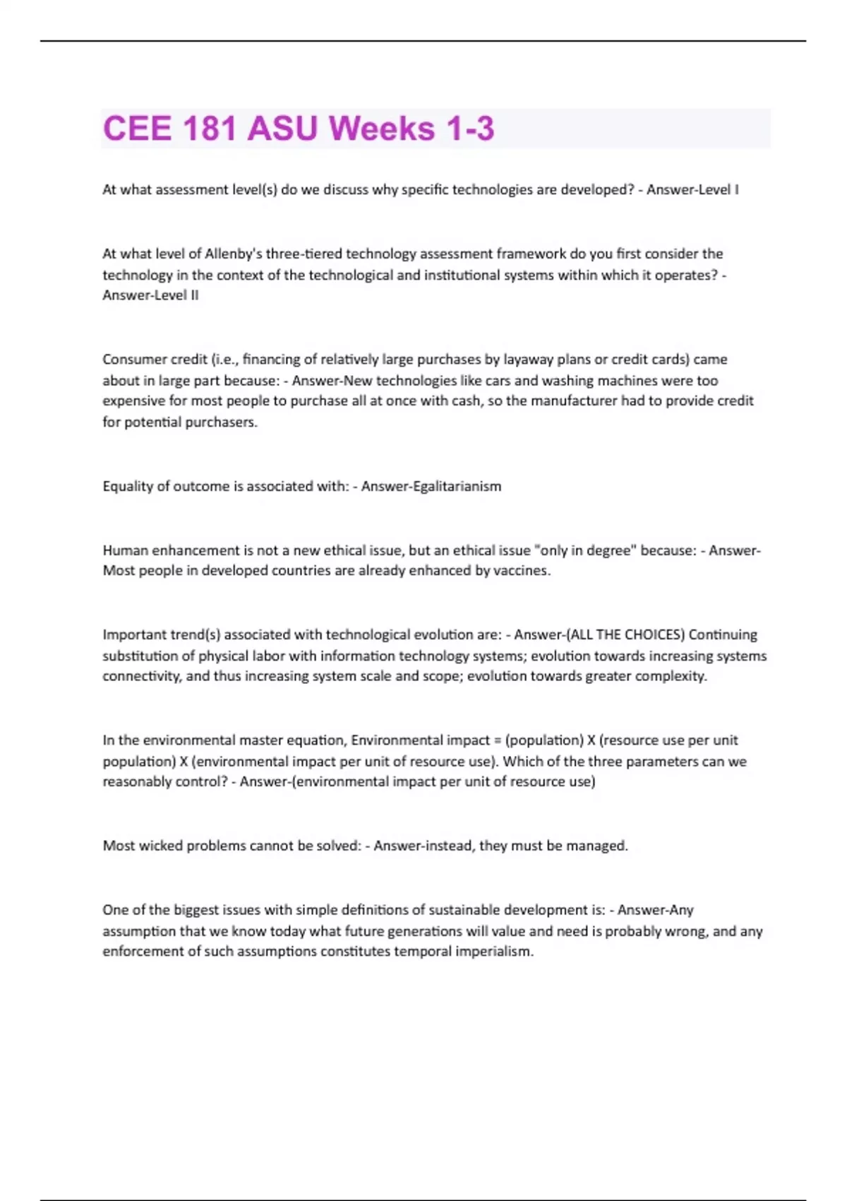 At what assessment level(s) do we discuss why specific technologies are developed? - Answer-Level I At what level of Allenby's three-tiered technology assessment framework do you first consider the technology in the context of the technological and institutional systems within which it operates? - Answer-Level II Consumer credit (i.e., financing of relatively large purchases by layaway plans or credit cards) came about in large part because: - Answer-New technologies like cars and washing machines were too expensive for most people to purchase all at once with cash, so the manufacturer had to provide credit for potential purchasers. Equality of outcome is associated with: - Answer-Egalitarianism Human enhancement is not a new ethical issue, but an ethical issue "only in degree" because: - AnswerMost people in developed countries are already enhanced by vaccines. Important trend(s) associated with technological evolution are: - Answer-(ALL THE CHOICES) Continuing substitution of physical labor with information technology systems; evolution towards increasing systems connectivity, and thus increasing system scale and scope; evolution towards greater complexity. In the environmental master equation, Environmental impact = (population) X (resource use per unit population) X (environmental impact per unit of resource use). Which of the three parameters can we reasonably control? - Answer-(environmental impact per unit of resource use) Most wicked problems cannot be solved: - Answer-instead, they must be managed. One of the biggest issues with simple definitions of sustainable development is: - Answer-Any assumption that we know today what future generations will value and need is probably wrong, and any enforcement of such assumptions constitutes temporal imperialism.Scale-free networks (such as the internet) are: - Answer-generally resilient to random failure but quite sensitive to targeted attack. Selecting "system boundaries" for an environmental assessment is among the hardest tasks in an analysis because: - Answer-(ALL OF THE ABOVE) certain boundaries can skew results and hide important impacts; boundary selection is frequently driven by how the results will be used; there is no "right" definition of a boundary; choosing boundaries for analysis is an art, not just a matter of following simple rules. Since it's inception, the dominance of the nation-state in world affairs has been obvious, but lately absolute nation-state control has been diluted by the rise of: - Answer-(ALL OF THE ABOVE) Numerous NGOs, trans- and multi-national corporations, and (presumably) non-political global bodies like the UN; Communities and interests representing global regions like Christianity and Islam; Powerful and influential billionaires providing seed money for technology development throughout the world. Since we are not running out of fossil fuel resources and can continue burning them for energy production for hundreds more years: - Answer-We must focus on the real problem which is what we are doing with combustion waste products like carbon dioxide. Social equity is a difficult goal for sustainability because: - Answer-It is defined dramatically differently in different worldviews. Sustainability typically holds which viewpoint regarding the 'value' of nature? - Answer-Nature has instrumental value Technological determinism is: - Answer-The idea that technology drives the development and progress of cultural, social, economic, religious, and other human systems.