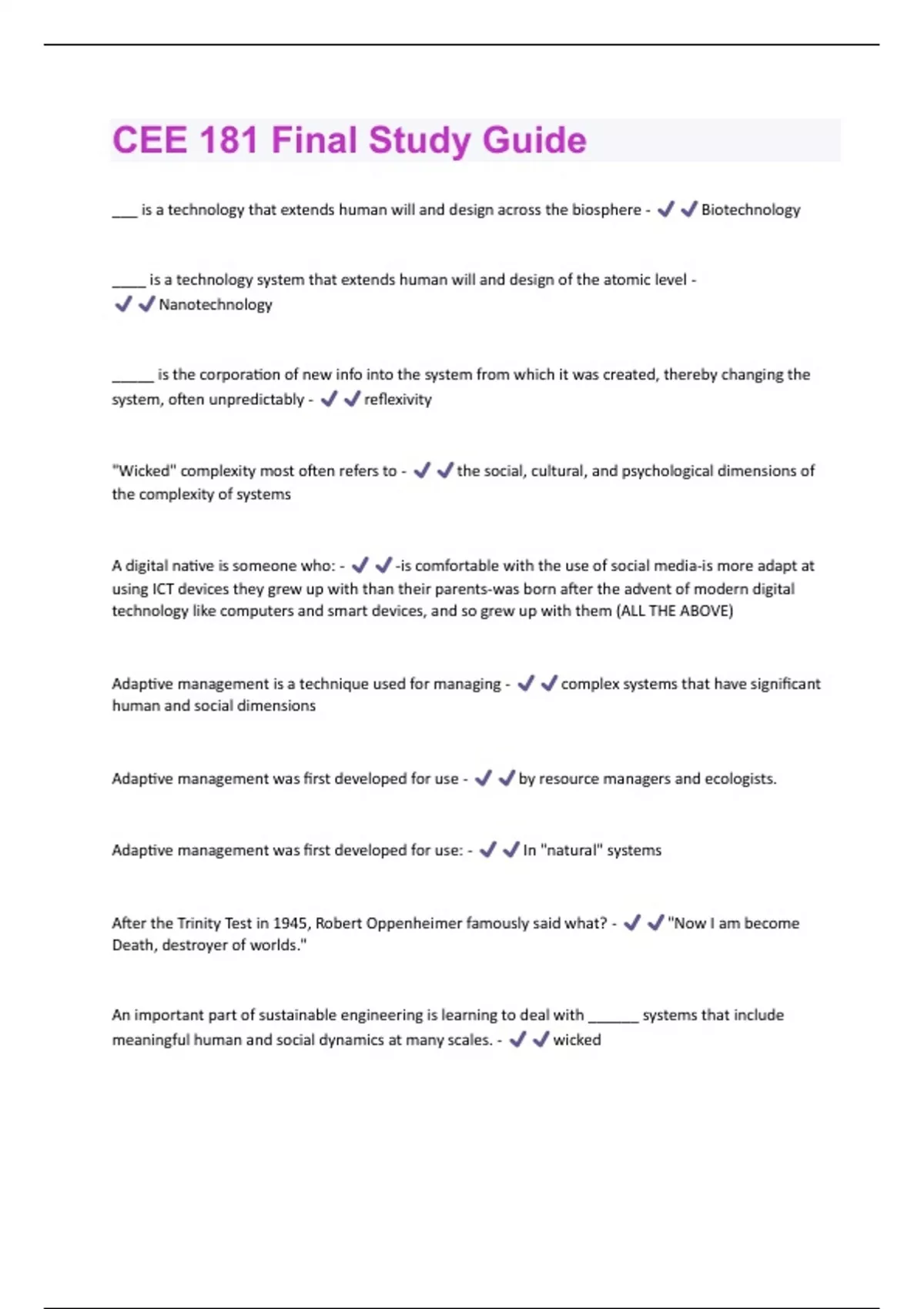 ___ is a technology that extends human will and design across the biosphere - Biotechnology ____ is a technology system that extends human will and design of the atomic level - Nanotechnology _____ is the corporation of new info into the system from which it was created, thereby changing the system, often unpredictably - reflexivity "Wicked" complexity most often refers to - the social, cultural, and psychological dimensions of the complexity of systems A digital native is someone who: - -is comfortable with the use of social media-is more adapt at using ICT devices they grew up with than their parents-was born after the advent of modern digital technology like computers and smart devices, and so grew up with them (ALL THE ABOVE) Adaptive management is a technique used for managing - complex systems that have significant human and social dimensions Adaptive management was first developed for use - by resource managers and ecologists. Adaptive management was first developed for use: - In "natural" systems After the Trinity Test in 1945, Robert Oppenheimer famously said what? - "Now I am become Death, destroyer of worlds." An important part of sustainable engineering is learning to deal with ______ systems that include meaningful human and social dynamics at many scales. - wickedAs a rule of thumb, the precautionary principle as stated in the UN charter for nature is - Naive As discussed in this lecture, augmented cognition or "augcog" is - an integration of humans and information technology (e.g., computers and networks) that enables humans to function more effectively in the increasingly technology-enabled world in which we live.