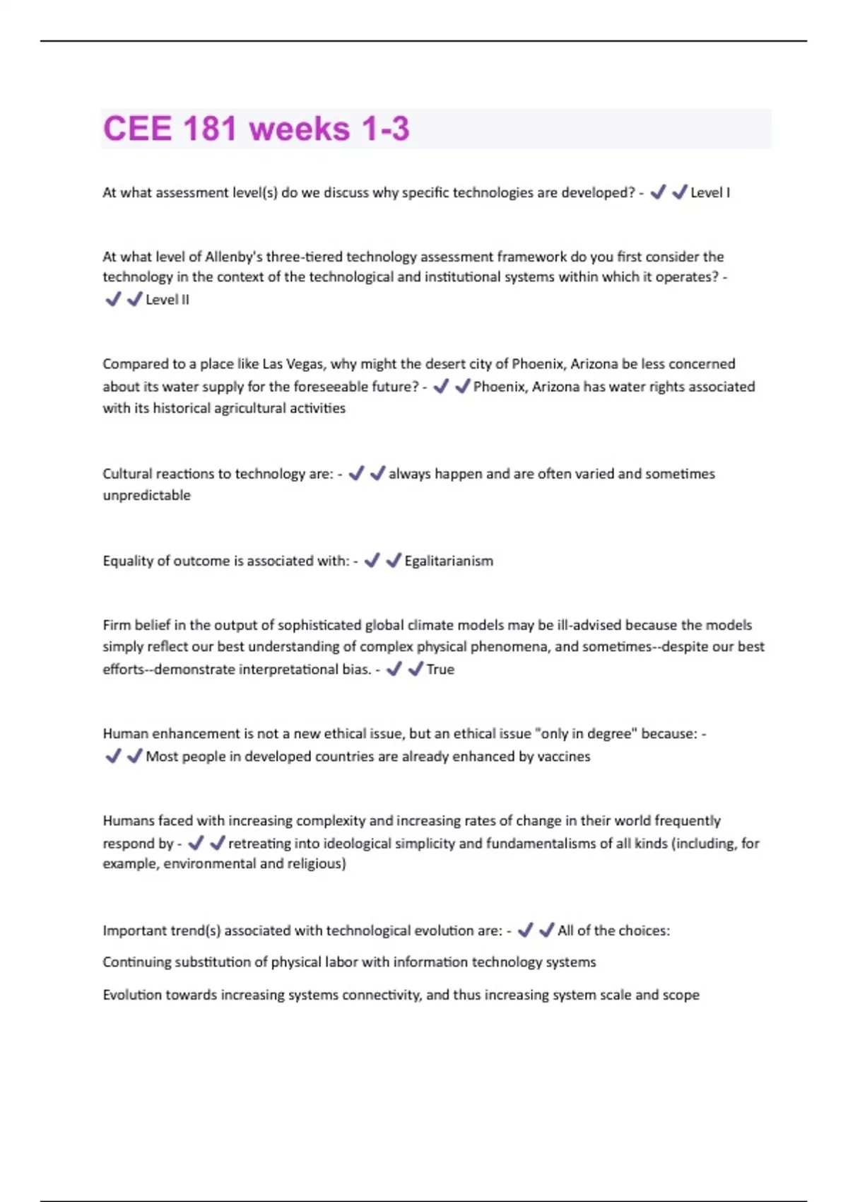 At what assessment level(s) do we discuss why specific technologies are developed? - Level I At what level of Allenby's three-tiered technology assessment framework do you first consider the technology in the context of the technological and institutional systems within which it operates? - Level II Compared to a place like Las Vegas, why might the desert city of Phoenix, Arizona be less concerned about its water supply for the foreseeable future? - Phoenix, Arizona has water rights associated with its historical agricultural activities Cultural reactions to technology are: - always happen and are often varied and sometimes unpredictable Equality of outcome is associated with: - Egalitarianism Firm belief in the output of sophisticated global climate models may be ill-advised because the models simply reflect our best understanding of complex physical phenomena, and sometimes--despite our best efforts--demonstrate interpretational bias. - True Human enhancement is not a new ethical issue, but an ethical issue "only in degree" because: - Most people in developed countries are already enhanced by vaccines Humans faced with increasing complexity and increasing rates of change in their world frequently respond by - retreating into ideological simplicity and fundamentalisms of all kinds (including, for example, environmental and religious) Important trend(s) associated with technological evolution are: - All of the choices: Continuing substitution of physical labor with information technology systems Evolution towards increasing systems connectivity, and thus increasing system scale and scopeEvolution towards greater complexity In the environmental master equation, Environmental impact = (population) X (resource use per unit population) X (environmental impact per unit of resource use). Which of the three parameters can we reasonably control? - (environmental impact per unit of resource use) Information technology changes faster than: - All of the choices: Culture Law Ethical structures Most science historians would likely agree that the Industrial Revolution is perhaps the most important "event" in human history. - True Most wicked problems cannot be solved - instead, they must be managed Once geoengineering technologies exist that enable us to control carbon levels in the atmosphere, the true problem surfaces because now we must come to agreement on what kind of climate/world we want. - True One of the biggest issues with simple definitions of sustainable development is: - any assumption that we know today what future generations will value and need is probably wrong, and any enforcement of such assumptions constitutes temporal imperialism Recent nation-state employment of private military companies makes us all more aware of the tragedies of war. - False Since we are not running out of fossil fuel resources and can continue burning them for energy production for hundreds more years - we must focus on the real problem which is what we are doing with the combustion waste products like carbon dioxideSocial equity is a difficult goal for sustainability because - it is defined dramatically differently in different worldviews Technological determinism is: - The idea that technology drives the development and progress of cultural, social, economic, religious, and other human systems Technology co-evolves with psychological structures, beliefs, and comfort zones - into which new technologies adapt, change, and consequently diffuse through society Technology system waves are also known as: - Kondratiev waves The "Navajo Bridge" story demonstrates that - engineering problems are not entirely technical The acronym, NGO, stands for: - Non-governmental organizations The Earth Systems Engineering and Management 'mental model' sees the relationship between humanity and nature in this manner: - Nature and the humans are closely linked, with human systems exerting significant influence over natural systems. The electric car is an example of a level ___ technology? - None. The levels outline how we can analyze impacts and policy for a given technology; they are not code words for the technologies themselves. The environmental impacts of the railroad are limited to damage done to the land on which the tracks, stations, and switching yards are built. - False The example of how the canal operators attempted to stop the railroad developers in the US demonstrates - how a previous generation of technology will defend itself, and struggle for survival against the next generation The infrastructure (e.g., roads, traffic signals, laws and regulations, gas stations) that supports automobile travel is an example of: - All of the above: