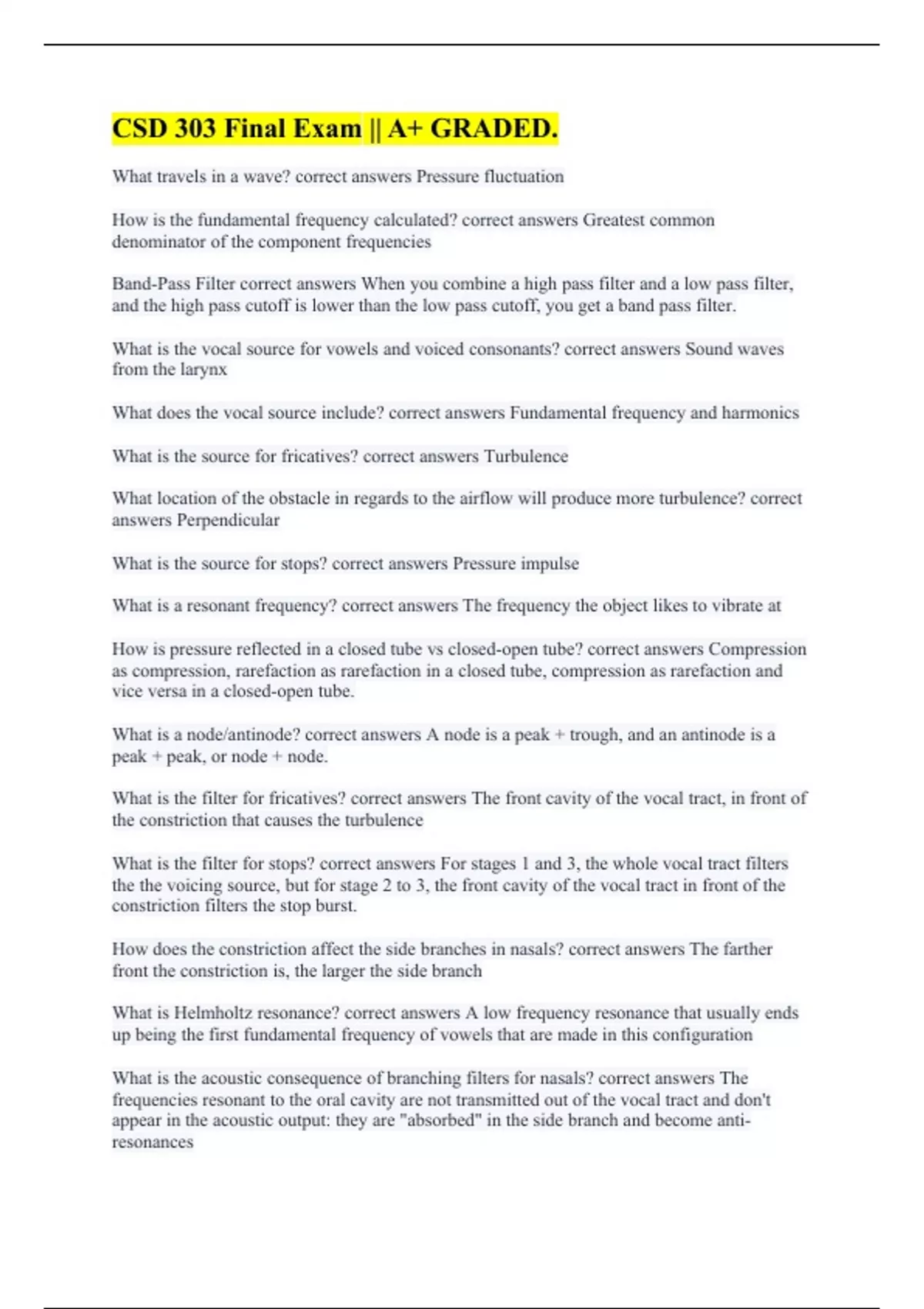 What travels in a wave? correct answers Pressure fluctuation How is the fundamental frequency calculated? correct answers Greatest common denominator of the component frequencies Band-Pass Filter correct answers When you combine a high pass filter and a low pass filter, and the high pass cutoff is lower than the low pass cutoff, you get a band pass filter. What is the vocal source for vowels and voiced consonants? correct answers Sound waves from the larynx What does the vocal source include? correct answers Fundamental frequency and harmonics What is the source for fricatives? correct answers Turbulence What location of the obstacle in regards to the airflow will produce more turbulence? correct answers Perpendicular What is the source for stops? correct answers Pressure impulse What is a resonant frequency? correct answers The frequency the object likes to vibrate at How is pressure reflected in a closed tube vs closed-open tube? correct answers Compression as compression, rarefaction as rarefaction in a closed tube, compression as rarefaction and vice versa in a closed-open tube. What is a node/antinode? correct answers A node is a peak + trough, and an antinode is a peak + peak, or node + node. What is the filter for fricatives? correct answers The front cavity of the vocal tract, in front of the constriction that causes the turbulence What is the filter for stops? correct answers For stages 1 and 3, the whole vocal tract filters the the voicing source, but for stage 2 to 3, the front cavity of the vocal tract in front of the constriction filters the stop burst. How does the constriction affect the side branches in nasals? correct answers The farther front the constriction is, the larger the side branch What is Helmholtz resonance? correct answers A low frequency resonance that usually ends up being the first fundamental frequency of vowels that are made in this configuration What is the acoustic consequence of branching filters for nasals? correct answers The frequencies resonant to the oral cavity are not transmitted out of the vocal tract and don't appear in the acoustic output: they are "absorbed" in the side branch and become anti-resonances