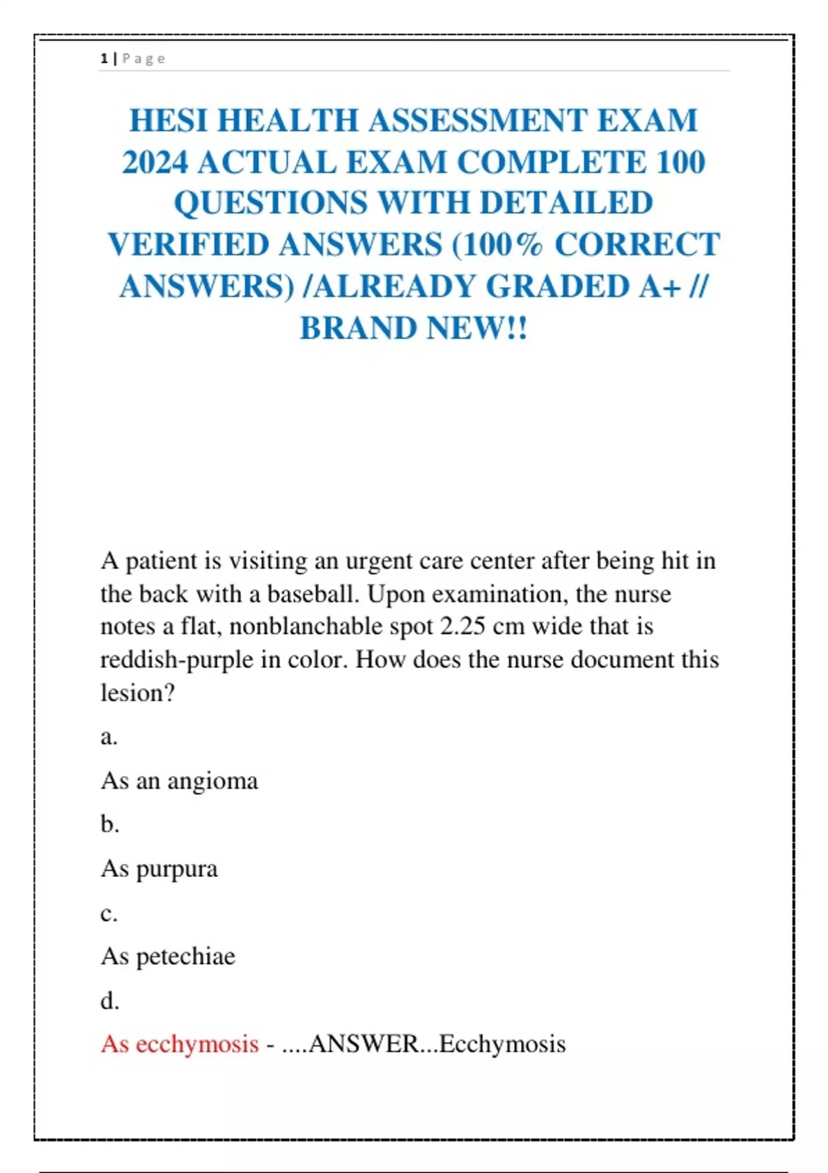 HESI HEALTH ASSESSMENT EXAM 2024 ACTUAL EXAM COMPLETE 100 QUESTIONS WITH DETAILED VERIFIED ANSWERS (100% CORRECT ANSWERS) /ALREADY GRADED A+ // BRAND NEW!!