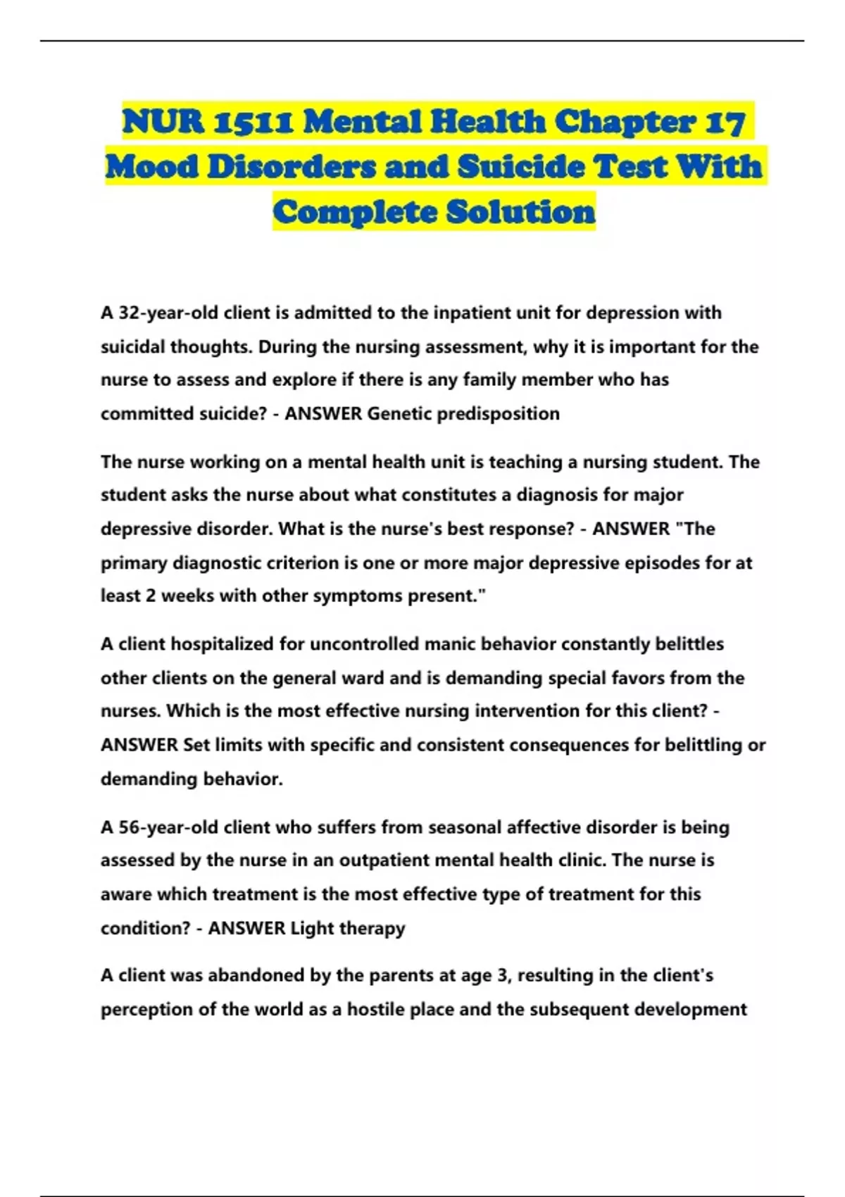 NUR 1511 Mental Health Chapter 17 Mood Disorders and Suicide Test With Complete Solution