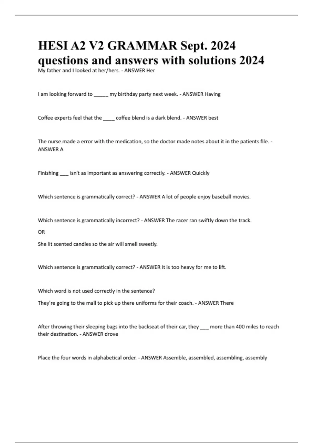 HESI A2 V2 GRAMMAR Sept. 2024 questions and answers with solutions 2024