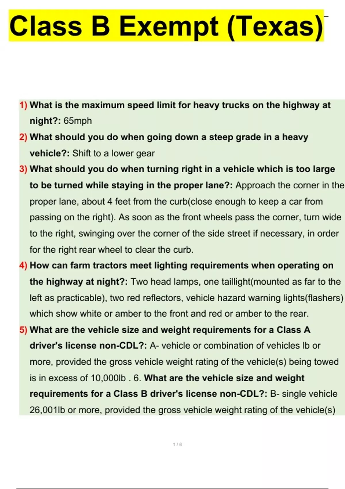 What is the maximum speed limit for heavy trucks on the highway at night? - 65mph What should you do when going down a steep grade in a heavy vehicle? - Shift to a lower gear What should you do when turning right in a vehicle which is too large to be turned while staying in the proper lane? - Approach the corner in the proper lane, about 4 feet from the curb(close enough to keep a car from passing on the right). As soon as the front wheels pass the corner, turn wide to the right, swinging over the corner of the side street if necessary, in order for the right rear wheel to clear the curb. How can farm tractors meet lighting requirements when operating on the highway at night? - Two head lamps, one taillight(mounted as far to the left as practicable), two red reflectors, vehicle hazard warning lights(flashers) which show white or amber to the front and red or amber to the rear. What are the vehicle size and weight requirements for a Class A driver's license non-CDL? - A- vehicle or combination of vehicles lb or more, provided the gross vehicle weight rating of the vehicle(s) being towed is in excess of 10,000lb