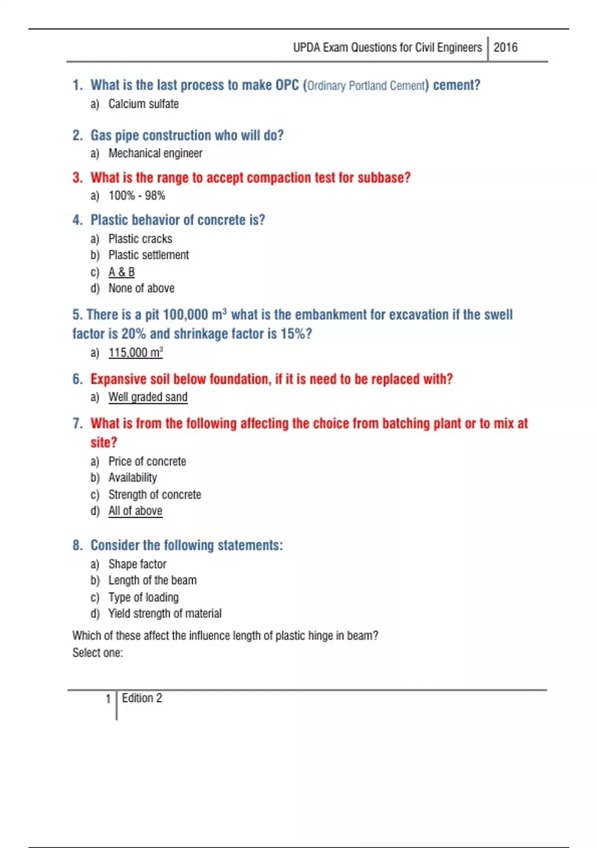 . What is the last process to make OPC (Ordinary Portland Cement) cement? a) Calcium sulfate 2. Gas pipe construction who will do? a) Mechanical engineer 3. What is the range to accept compaction test for subbase? a) 100% - 98% 4. Plastic behavior of concrete is? a) Plastic cracks b) Plastic settlement c) A & B d) None of above 5. There is a pit 100,000 m3 what is the embankment for excavation if the swell factor is 20% and shrinkage factor is 15%? a) 115,000 m3 6. Expansive soil below foundation, if it is need to be replaced with? a) Well graded sand 7. What is from the following affecting the choice from batching plant or to mix at site? a) Price of concrete b) Availability c) Strength of concrete d) All of above 8. Consider the following statements: a) Shape factor b) Length of the beam c) Type of loading d) Yield strength of material Which of these affect the influence length of plastic hinge in beam? Select one: 1 Edition 2 UPDA Exam Questions for Civil Engineers 2016 a) 1 only b) 1 and 3 c) 2 and 3 d) 3 and 4 9. Line connecting the same elevation on the map knows as: