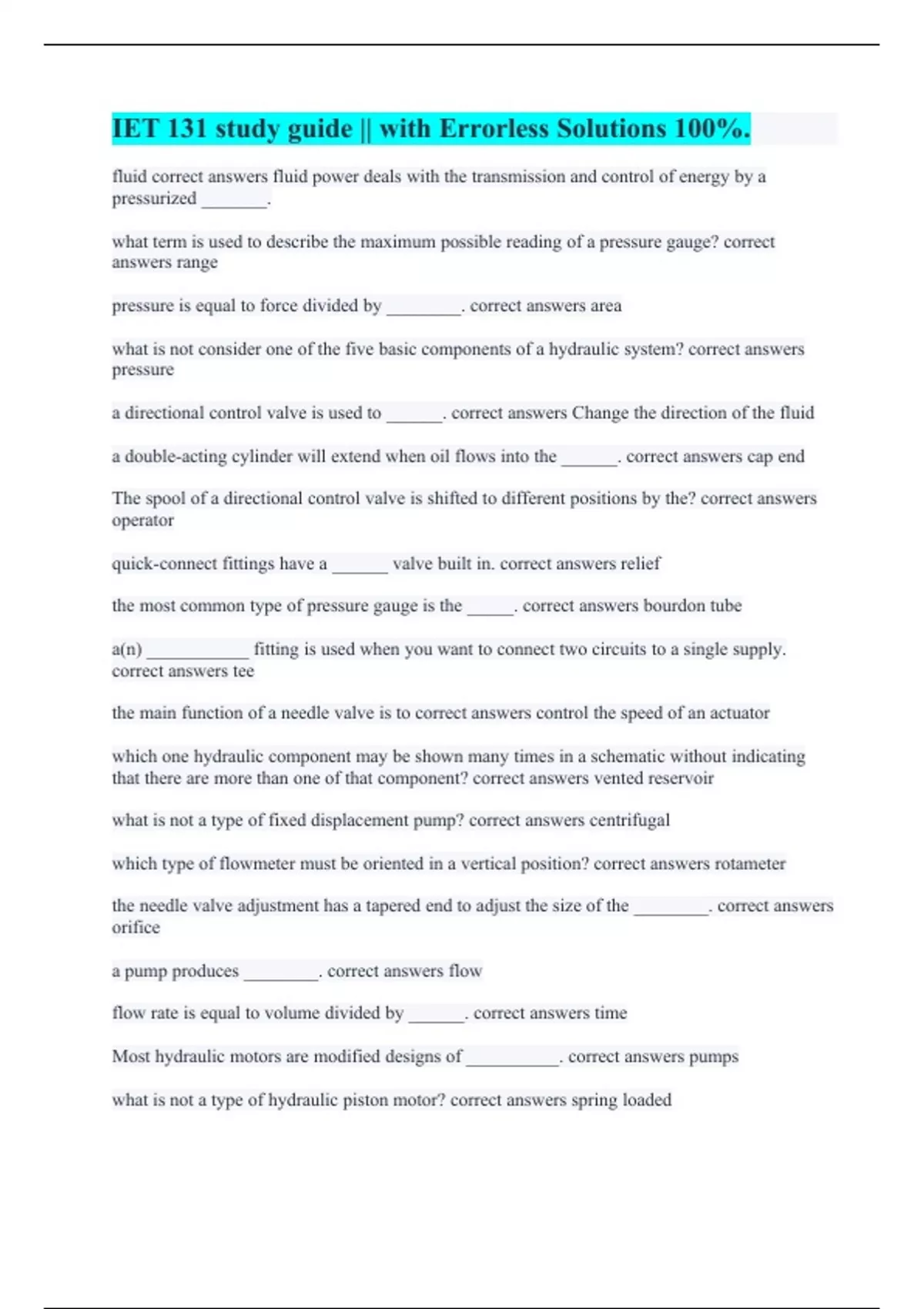 fluid correct answers fluid power deals with the transmission and control of energy by a pressurized _______. what term is used to describe the maximum possible reading of a pressure gauge? correct answers range pressure is equal to force divided by ________. correct answers area what is not consider one of the five basic components of a hydraulic system? correct answers pressure a directional control valve is used to ______. correct answers Change the direction of the fluid a double-acting cylinder will extend when oil flows into the ______. correct answers cap end The spool of a directional control valve is shifted to different positions by the? correct answers operator quick-connect fittings have a ______ valve built in. correct answers relief the most common type of pressure gauge is the _____. correct answers bourdon tube a(n) ___________ fitting is used when you want to connect two circuits to a single supply. correct answers tee the main function of a needle valve is to correct answers control the speed of an actuator which one hydraulic component may be shown many times in a schematic without indicating that there are more than one of that component? correct answers vented reservoir what is not a type of fixed displacement pump? correct answers centrifugal which type of flowmeter must be oriented in a vertical position? correct answers rotameter the needle valve adjustment has a tapered end to adjust the size of the ________. correct answers orifice a pump produces ________. correct answers flow flow rate is equal to volume divided by ______. correct answers time Most hydraulic motors are modified designs of __________. correct answers pumps what is not a type of hydraulic piston motor? correct answers spring loaded