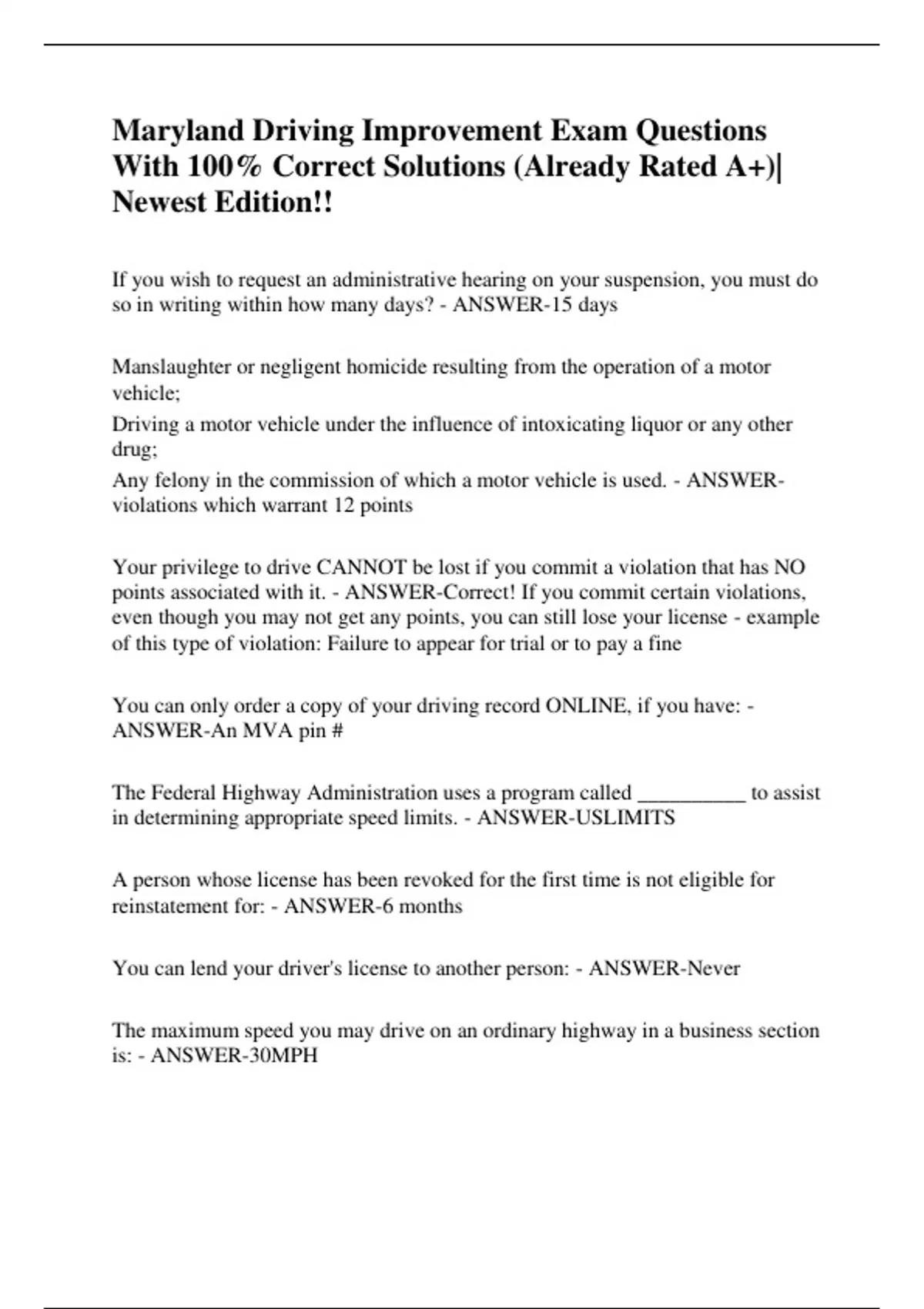 Maryland Driving Improvement Exam Questions With 100% Correct Solutions (Already Rated A+)| Newest Edition!!