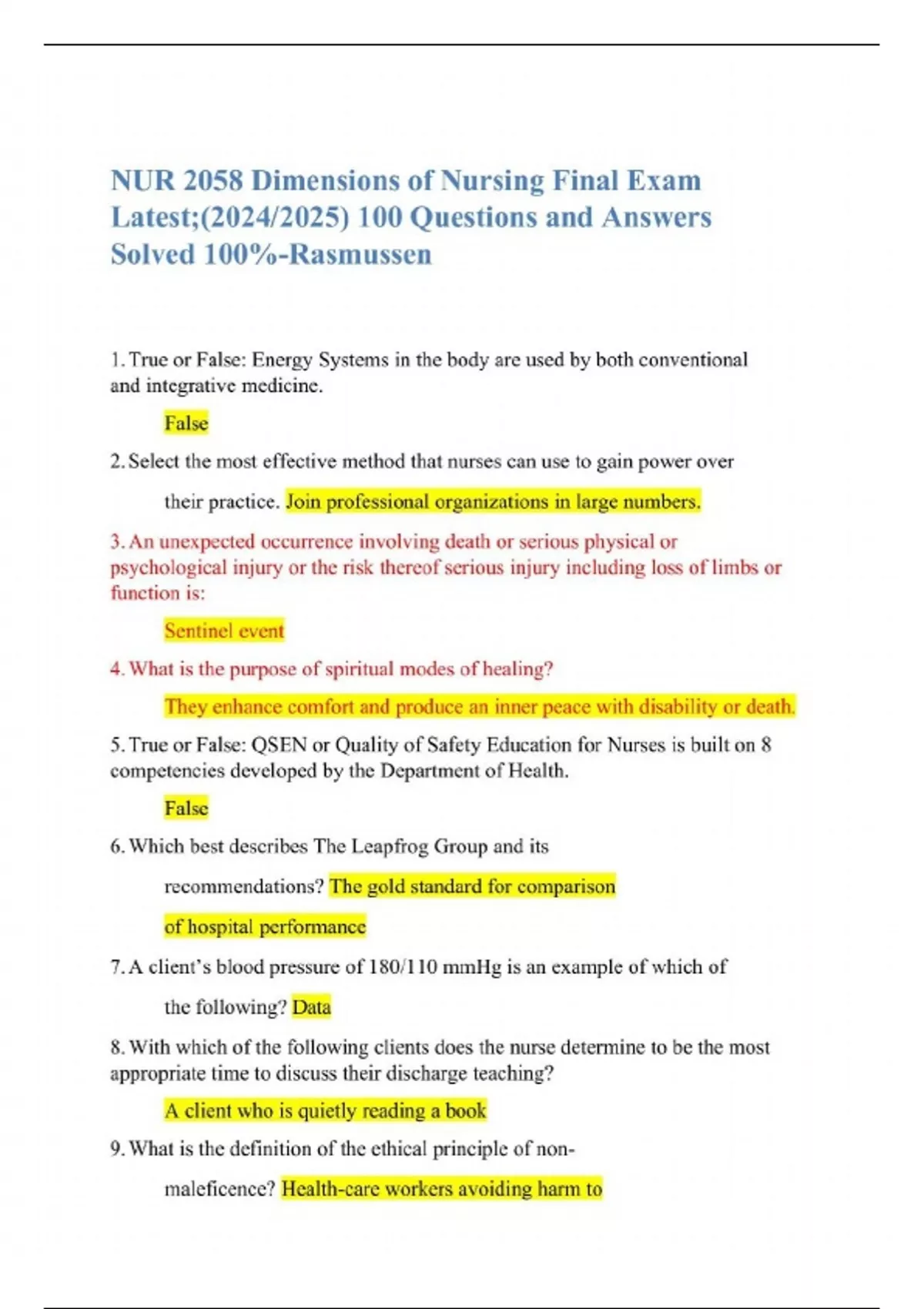 NUR 2058 Dimensions of Nursing Final Exam Latest;(2024/2025) 100 Questions and Answers Solved 100%-Rasmussen