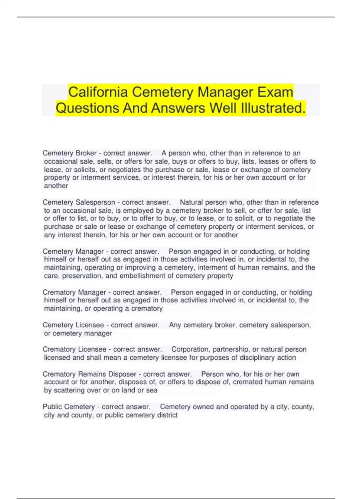 California Cemetery Manager Exam Questions And Answers Well Illustrated.