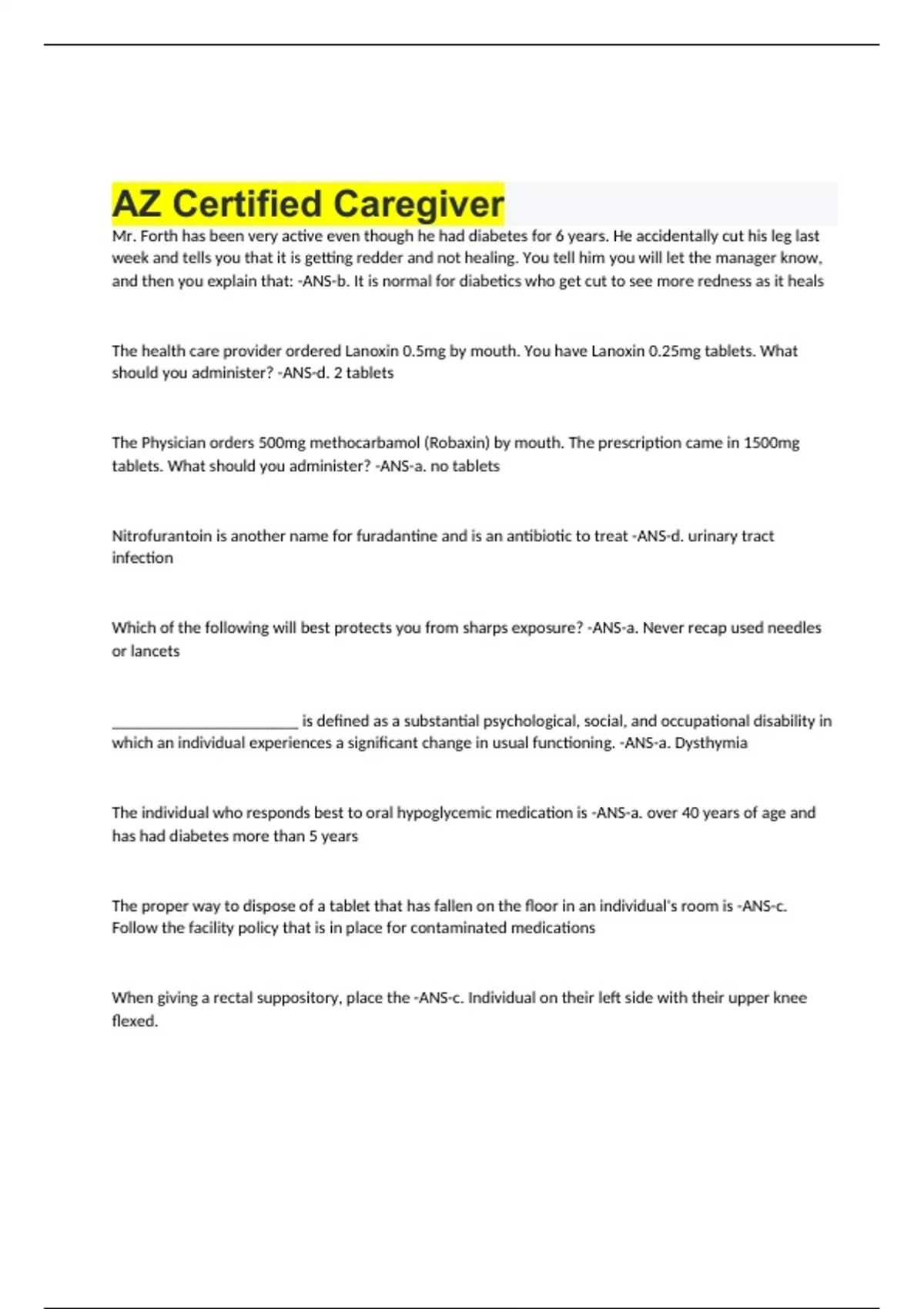 AZ Certified Caregiver Mr. Forth has been very active even though he had diabetes for 6 years. He accidentally cut his leg last week and tells you that it is getting redder and not healing. You tell him you will let the manager know, and then you explain that: -ANS-b. It is normal for diabetics who get cut to see more redness as it heals The health care provider ordered Lanoxin 0.5mg by mouth. You have Lanoxin 0.25mg tablets. What should you administer? -ANS-d. 2 tablets The Physician orders 500mg methocarbamol (Robaxin) by mouth. The prescription came in 1500mg tablets. What should you administer? -ANS-a. no tablets Nitrofurantoin is another name for furadantine and is an antibiotic to treat -ANS-d. urinary tract infection
