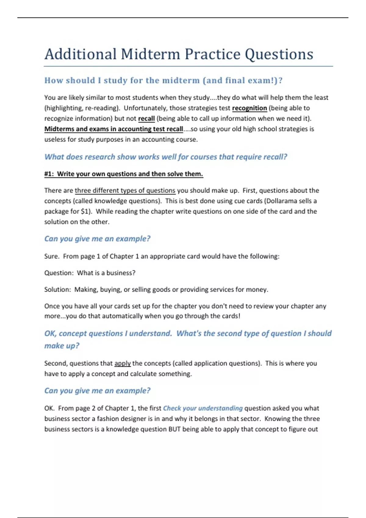 How should I study for the midterm (and final exam!)? You are likely similar to most students when they study....they do what will help them the least (highlighting, re-reading). Unfortunately, those strategies test recognition (being able to recognize information) but not recall (being able to call up information when we need it). Midterms and exams in accounting test recall....so using your old high school strategies is useless for study purposes in an accounting course. What does research show works well for courses that require recall? #1: Write your own questions and then solve them. There are three different types of questions you should make up. First, questions about the concepts (called knowledge questions). This is best done using cue cards (Dollarama sells a package for $1). While reading the chapter write questions on one side of the card and the solution on the other. Can you give me an example? Sure. From page 1 of Chapter 1 an appropriate card would have the following: Question: What is a business? Solution: Making, buying, or selling goods or providing services for money. Once you have all your cards set up for the chapter you don't need to review your chapter any more...you do that automatically when you go through the cards! OK, concept questions I understand. What's the second type of question I should make up? Second, questions that apply the concepts (called application questions). This is where you have to apply a concept and calculate something. Can you give me an example? OK. From page 2 of Chapter 1, the first Check your understanding question asked you what business sector a fashion designer is in and why it belongs in that sector. Knowing the three business sectors is a knowledge question BUT being able to apply that concept to figure out which businesses are in which sectors is an application of knowledge. These types of q