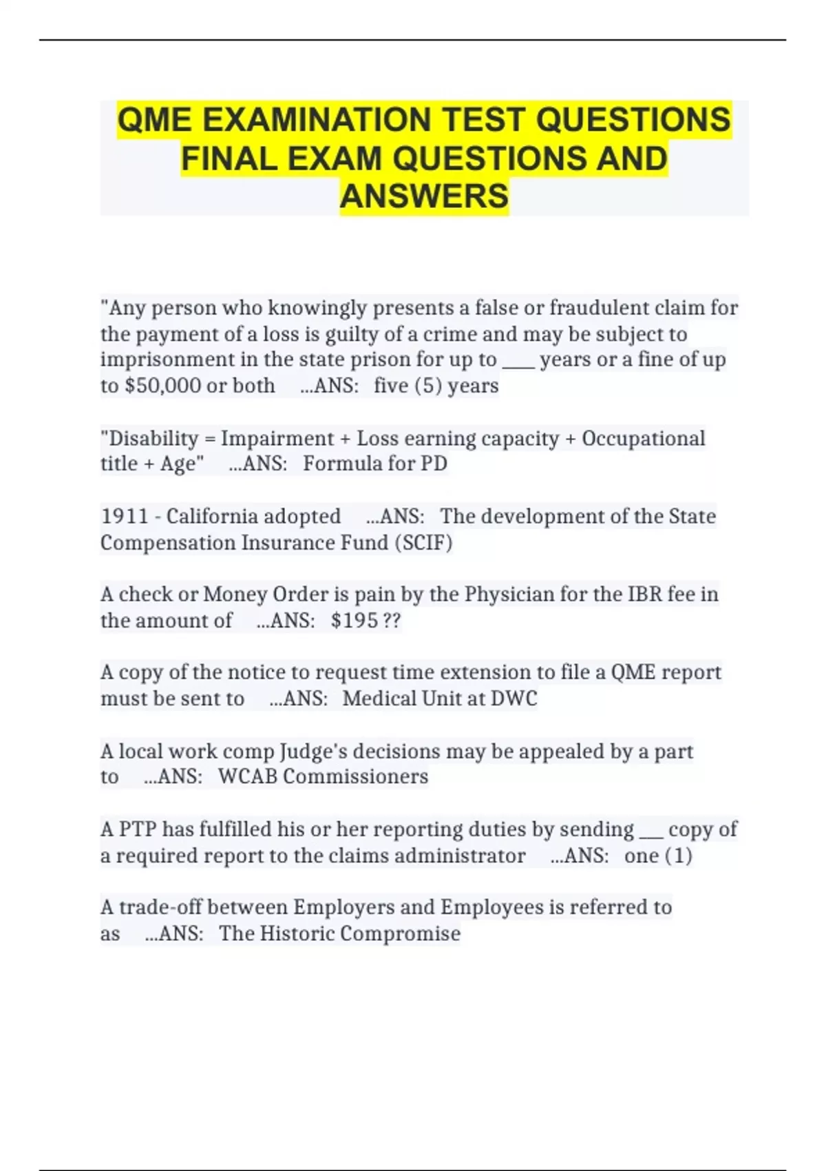 QME EXAMINATION TEST QUESTIONS FINAL EXAM QUESTIONS AND ANSWERS