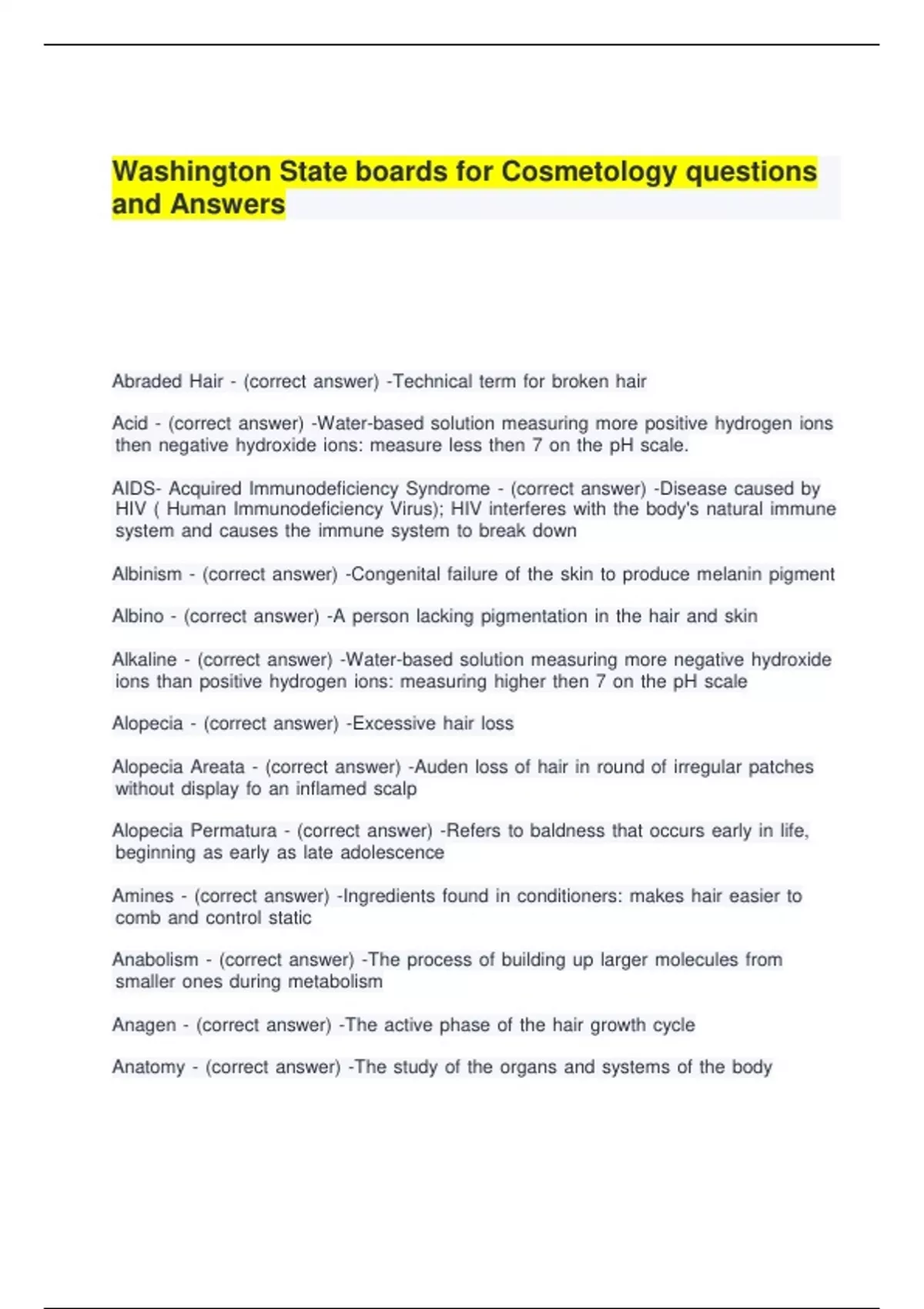 Washington State boards for Cosmetology questions and Answers.