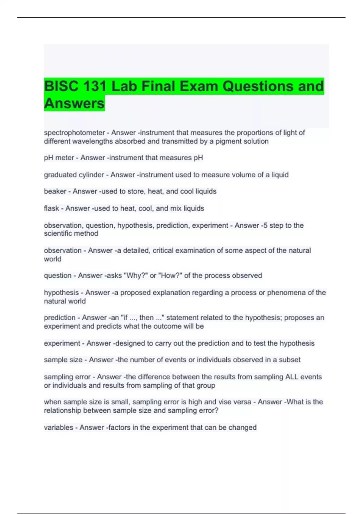 BISC 131 Lab Final Exam Questions and