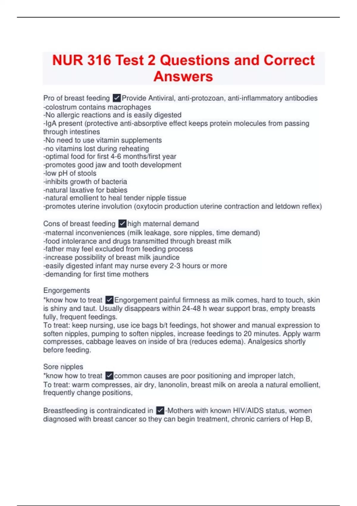 Pro of breast feeding Provide Antiviral, anti-protozoan, anti-inflammatory antibodies -colostrum contains macrophages -No allergic reactions and is easily digested -IgA present (protective anti-absorptive effect keeps protein molecules from passing through intestines -No need to use vitamin supplements -no vitamins lost during reheating -optimal food for first 4-6 months/first year -promotes good jaw and tooth development -low pH of stools -inhibits growth of bacteria -natural laxative for babies -natural emollient to heal tender nipple tissue -promotes uterine involution (oxytocin production uterine contraction and letdown reflex) Cons of breast feeding high maternal demand -maternal inconveniences (milk leakage, sore nipples, time demand) -food intolerance and drugs transmitted through breast milk -father may feel excluded from feeding process -increase possibility of breast milk jaundice -easily digested infant may nurse every 2-3 hours or more -demanding for first time mothers Engorgements *know how to treat Engorgement painful firmness as milk comes, hard to touch, skin is shiny and taut. Usually disappears within 24-48 h wear support bras, empty breasts fully, frequent feedings. To treat: keep nursing, use ice bags b/t feedings, hot shower and manual expression to soften nipples, pumping to soften nipples, increase feedings to 20 minutes. Apply warm compresses, cabbage leaves on inside of bra (reduces edema). Analgesics shortly before feeding. Sore nipples *know how to treat common causes are poor positioning and improper latch, To treat: warm compresses, air dry, lanonolin, breast milk on areola a natural emollient, frequently change positions, Breastfeeding is contraindicated in -Mothers with known HIV/AIDS status, women diagnosed with breast cancer so they can begin treatment, chronic carriers of Hep B