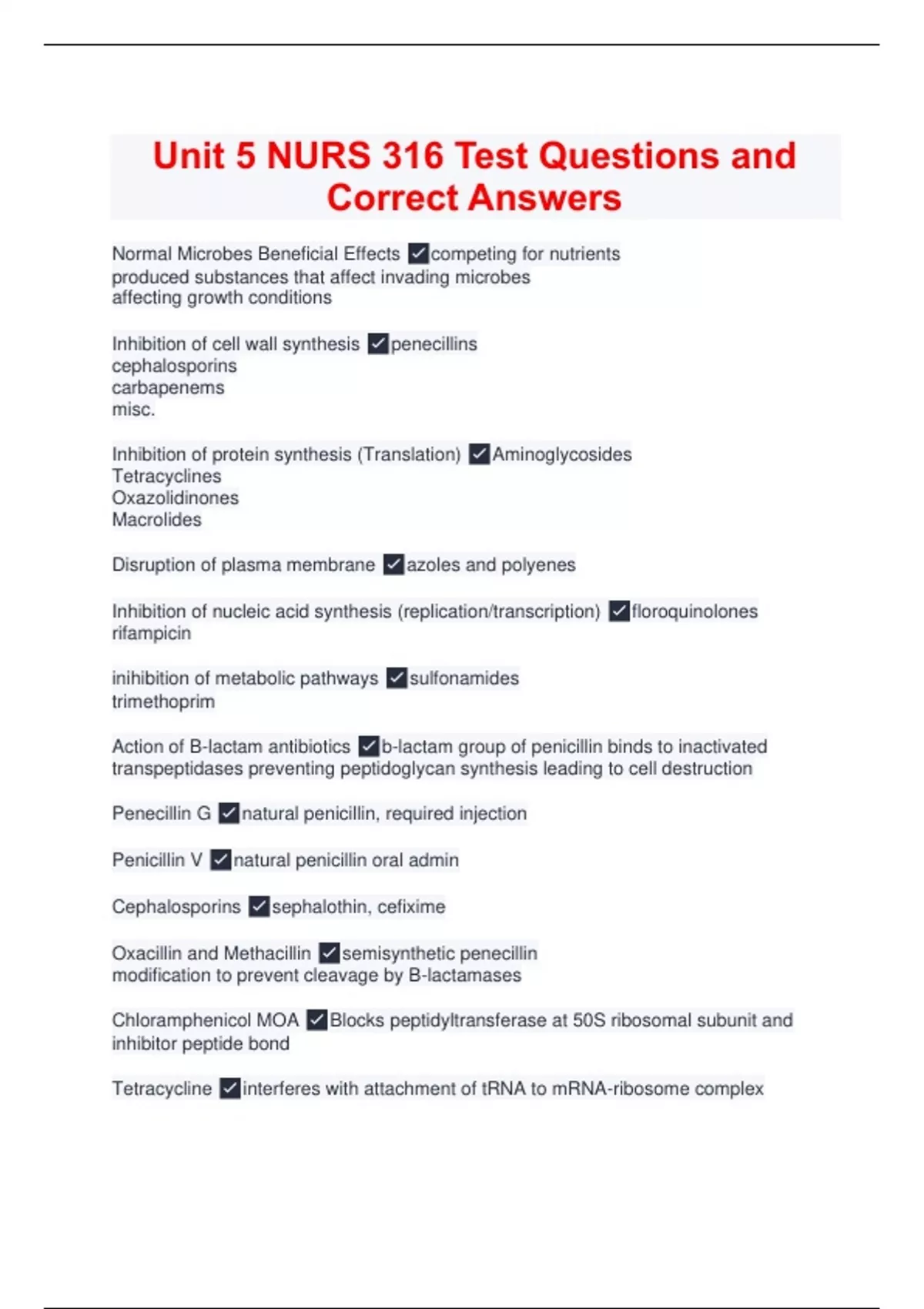 Normal Microbes Beneficial Effects competing for nutrients produced substances that affect invading microbes affecting growth conditions Inhibition of cell wall synthesis penecillins cephalosporins carbapenems misc. Inhibition of protein synthesis (Translation) Aminoglycosides Tetracyclines Oxazolidinones Macrolides Disruption of plasma membrane azoles and polyenes Inhibition of nucleic acid synthesis (replication/transcription) floroquinolones rifampicin inihibition of metabolic pathways sulfonamides trimethoprim Action of B-lactam antibiotics b-lactam group of penicillin binds to inactivated transpeptidases preventing peptidoglycan synthesis leading to cell destruction Penecillin G natural penicillin, required injection Penicillin V natural penicillin oral admin Cephalosporins sephalothin, cefixime Oxacillin and Methacillin semisynthetic penecillin modification to prevent cleavage by B-lactamases Chloramphenicol MOA Blocks peptidyltransferase at 50S ribosomal subunit and inhibitor peptide bond Tetracycline interferes with attachment of tRNA to mRNA-ribosome complex Streptomycin changes shape of the 30S potion causing code on mRNA to be read incorrectly