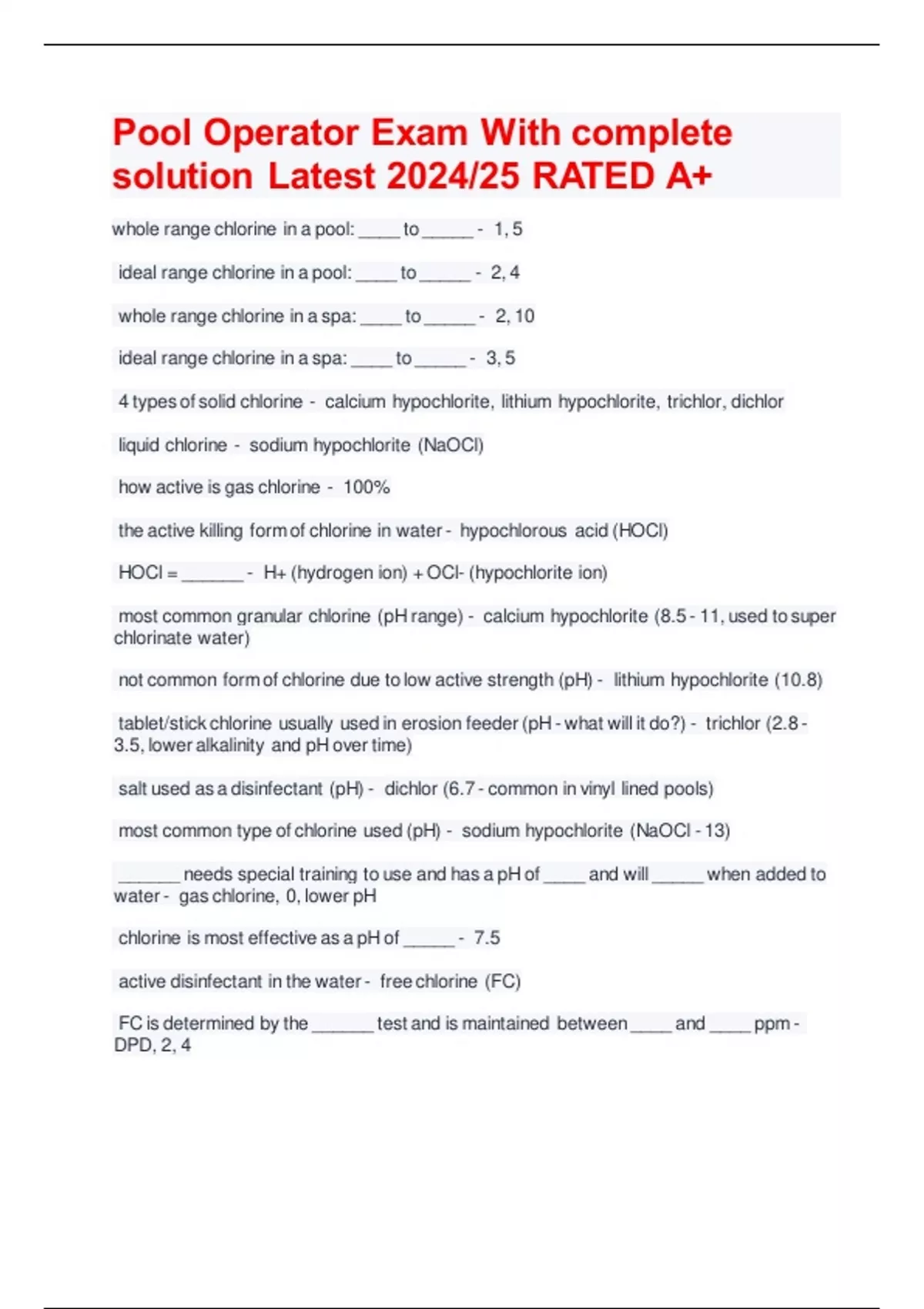 Pool Operator Exam With complete solution Latest 2024/25 RATED A+
