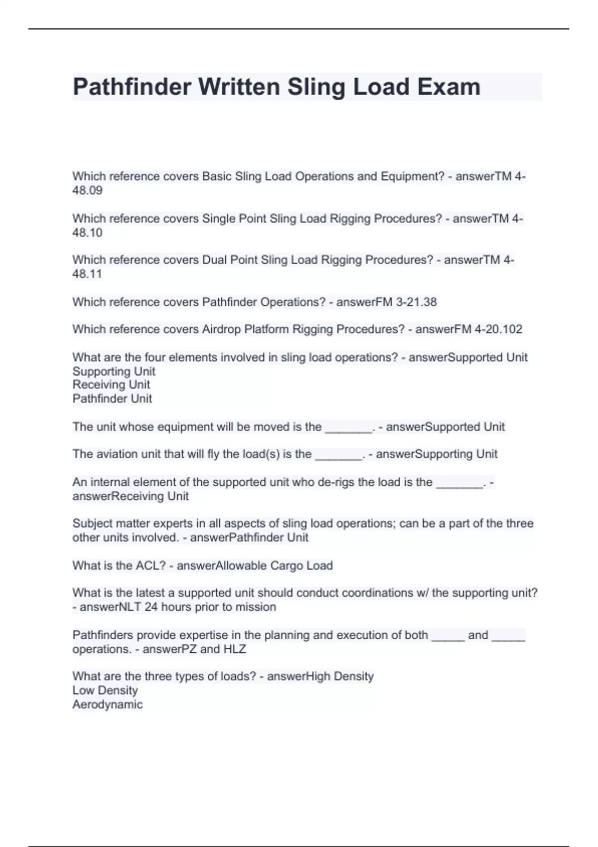 Pathfinder Written Sling Load Exam Questions with Solutions