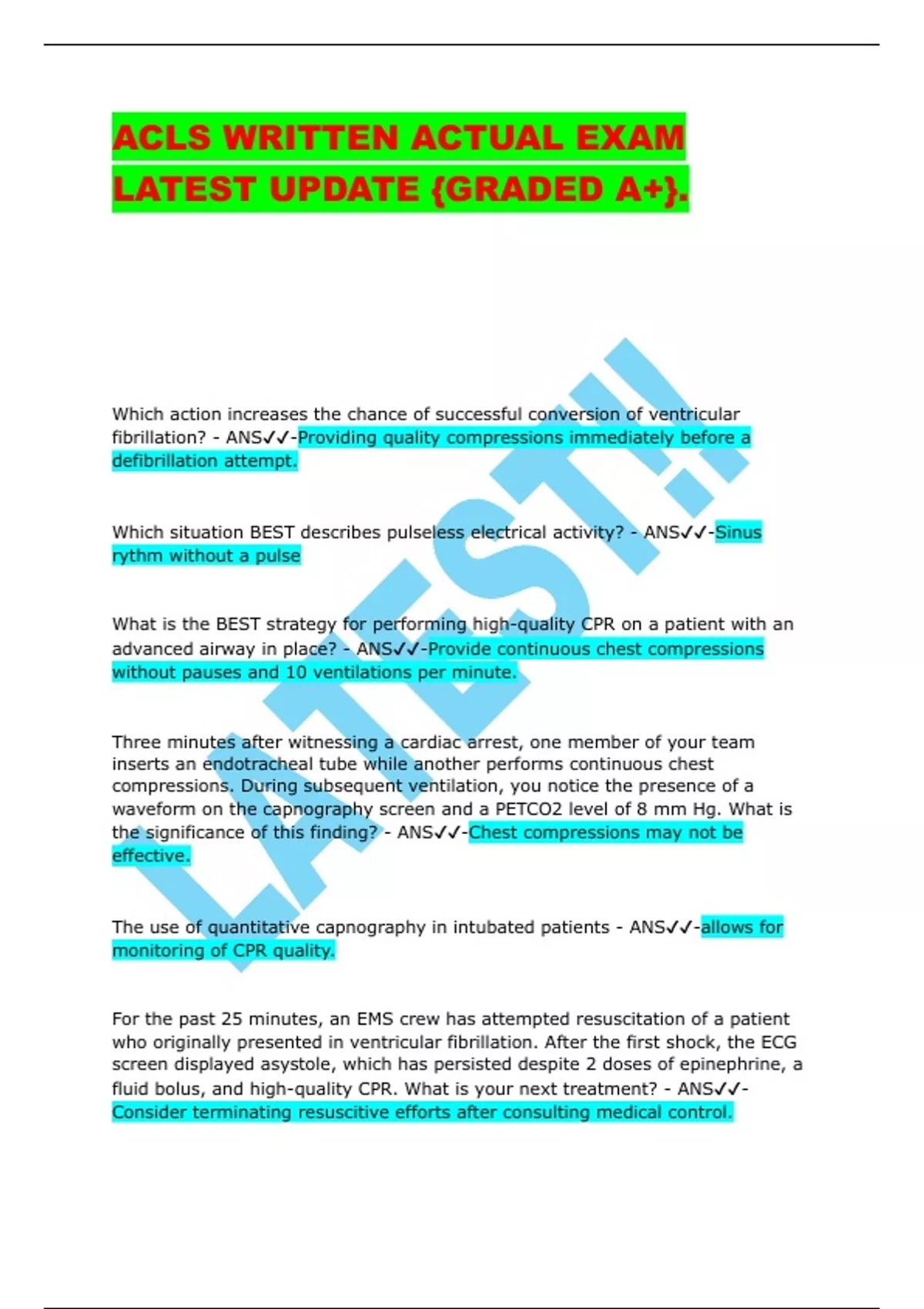 ACLS WRITTEN ACTUAL EXAM LATEST UPDATE {GRADED A+}. Which action increases the chance of successful conversion of ventricular fibrillation? - ANS-Providing quality compressions immediately before a defibrillation attempt. Which situation BEST describes pulseless electrical activity? - ANS-Sinus rythm without a pulse What is the BEST strategy for performing high-quality CPR on a patient with an advanced airway in place? - ANS-Provide continuous chest compressions without pauses and 10 ventilations per minute. Three minutes after witnessing a cardiac arrest, one member of your team inserts an endotracheal tube while another performs continuous chest compressions. During subsequent ventilation, you notice the presence of a waveform on the capnography screen and a PETCO2 level of 8 mm Hg. What is the significance of this finding? - ANS-Chest compressions may not be effective. The use of quantitative capnography in intubated patients - ANS-allows for monitoring of CPR quality. For the past 25 minutes, an EMS crew has attempted resuscitation of a patient who originally presented in ventricular fibrillation. After the first shock, the ECG screen displayed asystole, which has persisted despite 2 doses of epinephrine, a fluid bolus, and high-quality CPR. What is your next treatment? - ANS- Consider terminating resuscitive efforts after consulting medical control. Which is a safe and effective practice within the defibrillation sequence? - ANS-Be sure oxygen is not blowing over the patient's chest during the shock. During your assessment, your patient suddenly loses consciousness. After calling for help and determining that the patient is not breathing, you are unsure whether the patient has a pulse. What is your next action? - ANS-Begin chest compressions. What is an advantage of using hands-free defibrillation pads instead of defibrillation paddles? - ANS-Hands-free pads allow for a more rapid defibrillation. What action is recommended to help minimize interruptions in chest compressions during CPR? - ANS-Continue CPR while charging the defibrillator. Which action is included in the BLS survey? - ANS-Early defibrillation Which drug and dose are recommended for the management of a patient in refractory ventricular fibrillation? - ANS-Amioderone 300mg What is the appropriate interval for an interruption in chest compressions? - ANS-10 seconds or less Which of the following is a sign of effective CPR? - ANS-PETCO2 ≥10 mm Hg What is the primary purpose of a medical emergency team (MET) or rapid response team (RRT)? - ANS-Identifying and treating early clinical deterioration.