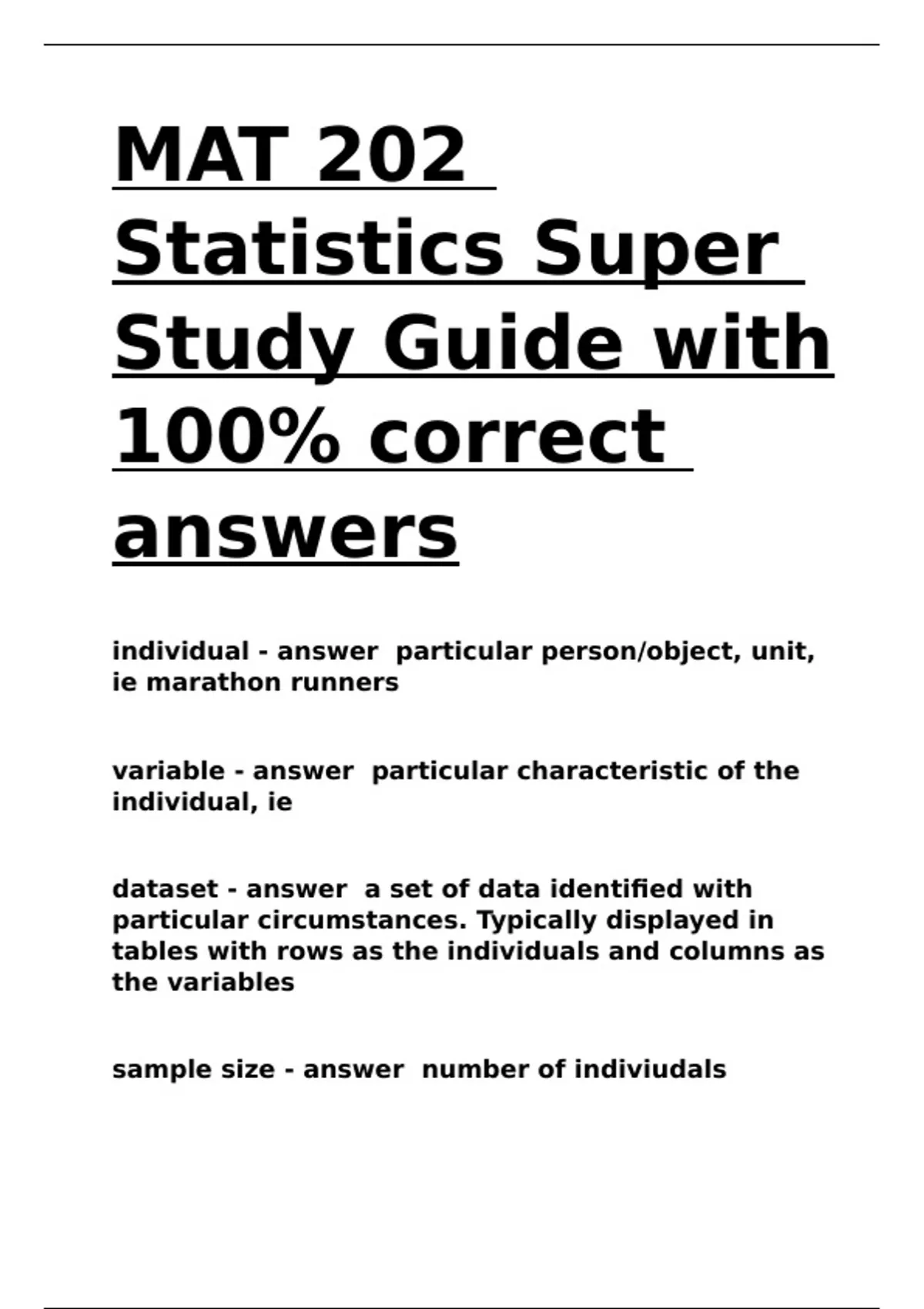 MAT 202 Statistics Super Study Guide with 100- correct answers