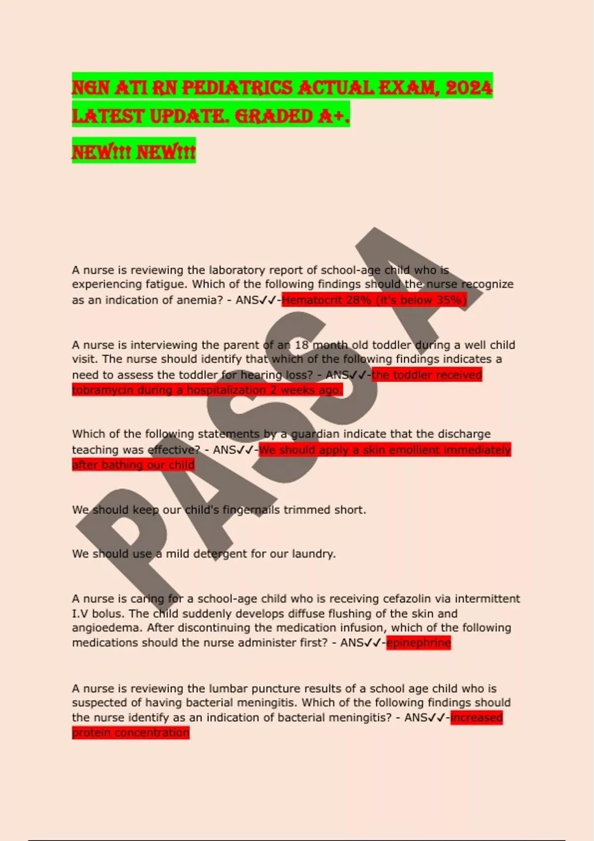 NGN ATI RN PEDIATRICS ACTUAL EXAM, 2024 LATEST UPDATE. GRADED A+. NEW!!! NEW!!! A nurse is reviewing the laboratory report of school-age child who is experiencing fatigue. Which of the following findings should the nurse recognize as an indication of anemia? - ANS-Hematocrit 28% (it's below 35%) A nurse is interviewing the parent of an 18 month old toddler during a well child visit. The nurse should identify that which of the following findings indicates a need to assess the toddler for hearing loss? - ANS-the toddler received tobramycin during a hospitalization 2 weeks ago. Which of the following statements by a guardian indicate that the discharge teaching was effective? - ANS-We should apply a skin emollient immediately after bathing our child We should keep our child's fingernails trimmed short. We should use a mild detergent for our laundry. A nurse is caring for a school-age child who is receiving cefazolin via intermittent I.V bolus. The child suddenly develops diffuse flushing of the skin and angioedema. After discontinuing the medication infusion, which of the following medications should the nurse administer first? - ANS-epinephrine A nurse is reviewing the lumbar puncture results of a school age child who is suspected of having bacterial meningitis. Which of the following findings should the nurse identify as an indication of bacterial meningitis? - ANS-increased protein concentration A nurse is preparing to collect a sample from a toddler for a sickle-turbidity test. which of the following actions should the nurse plan to take? - ANS-Perform a finger stick A nurse is providing dietary teaching to the parent of a school age child who has celiac disease. The nurse should recommend that the parent offer which of the following foods to the child? - ANS-White rice A nurse in an emergency department is performing a physical assessment on a 2 week old male newborn. Which of the following findings is the priority for the nurse to report to the provider? - ANS-substernal retractions A nurse is caring for an adolescent who received a kidney transplant. which of the following findings should the nurse identify as an indication the adolescent is rejecting the kidney? - ANS-serum creatinine 3.0 mg/dl