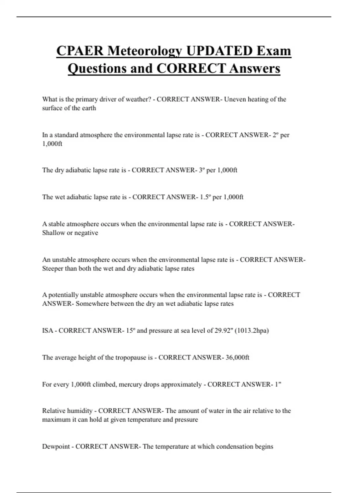 CPAER Meteorology UPDATED Exam Questions and CORRECT Answers What is the primary driver of weather? - CORRECT ANSWER- Uneven heating of the surface of the earth In a standard atmosphere the environmental lapse rate is - CORRECT ANSWER- 2º per 1,000ft The dry adiabatic lapse rate is - CORRECT ANSWER- 3º per 1,000ft The wet adiabatic lapse rate is - CORRECT ANSWER- 1.5º per 1,000ft A stable atmosphere occurs when the environmental lapse rate is - CORRECT ANSWERShallow or negative