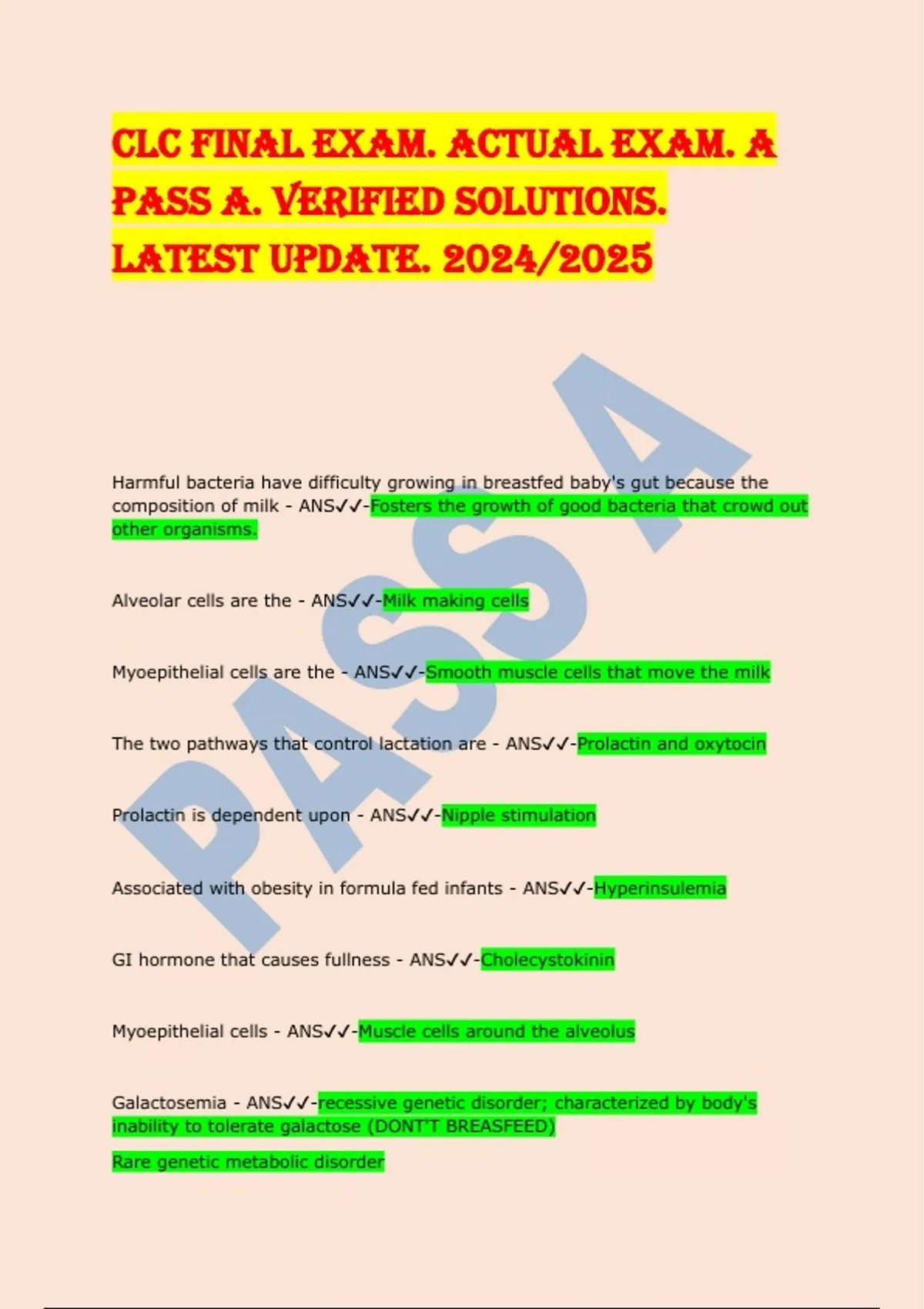 CLC FINAL EXAM. ACTUAL EXAM. A PASS A. VERIFIED SOLUTIONS. LATEST UPDATE. 2024/2025 Harmful bacteria have difficulty growing in breastfed baby's gut because the composition of milk - ANS-Fosters the growth of good bacteria that crowd out other organisms. Alveolar cells are the - ANS-Milk making cells Myoepithelial cells are the - ANS-Smooth muscle cells that move the milk The two pathways that control lactation are - ANS-Prolactin and oxytocin Prolactin is dependent upon - ANS-Nipple stimulation Associated with obesity in formula fed infants - ANS-Hyperinsulemia GI hormone that causes fullness - ANS-Cholecystokinin Myoepithelial cells - ANS-Muscle cells around the alveolus Galactosemia - ANS-recessive genetic disorder; characterized by body's inability to tolerate galactose (DONT'T BREASFEED) Rare genetic metabolic disorder ONLY absolute Infant health reason not to nurse him Contraindications for Breastfeeding - ANS-HIV Drugs TB Radiation Anti-Retro Virals Brucellosis Counselors Role - ANS-Educate Validate Counter Negativity Support Counseling Process - ANS-Gather Verify Info Work Together Review & Fine Tune Follow-up First Hour of Baby - ANS-Cry Relax Awake Rest Crawl/Slide Familiarize Suck Sleep Feed Baby - ANS-Light Sleep