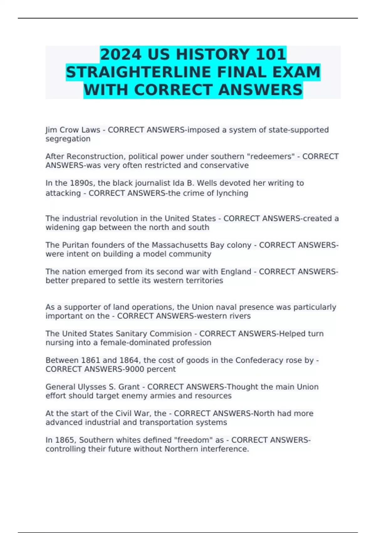 2024 US HISTORY 101 STRAIGHTERLINE FINAL EXAM WITH CORRECT ANSWERS