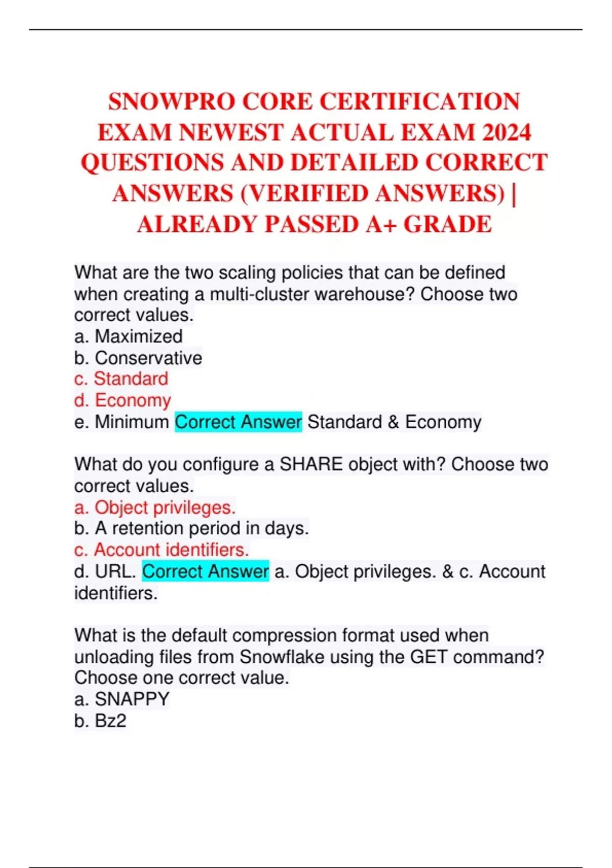 SNOWPRO CORE CERTIFICATION EXAM NEWEST ACTUAL EXAM 2024 QUESTIONS AND DETAILED CORRECT ANSWERS (VERIFIED ANSWERS) | ALREADY PASSED A+ GRADE